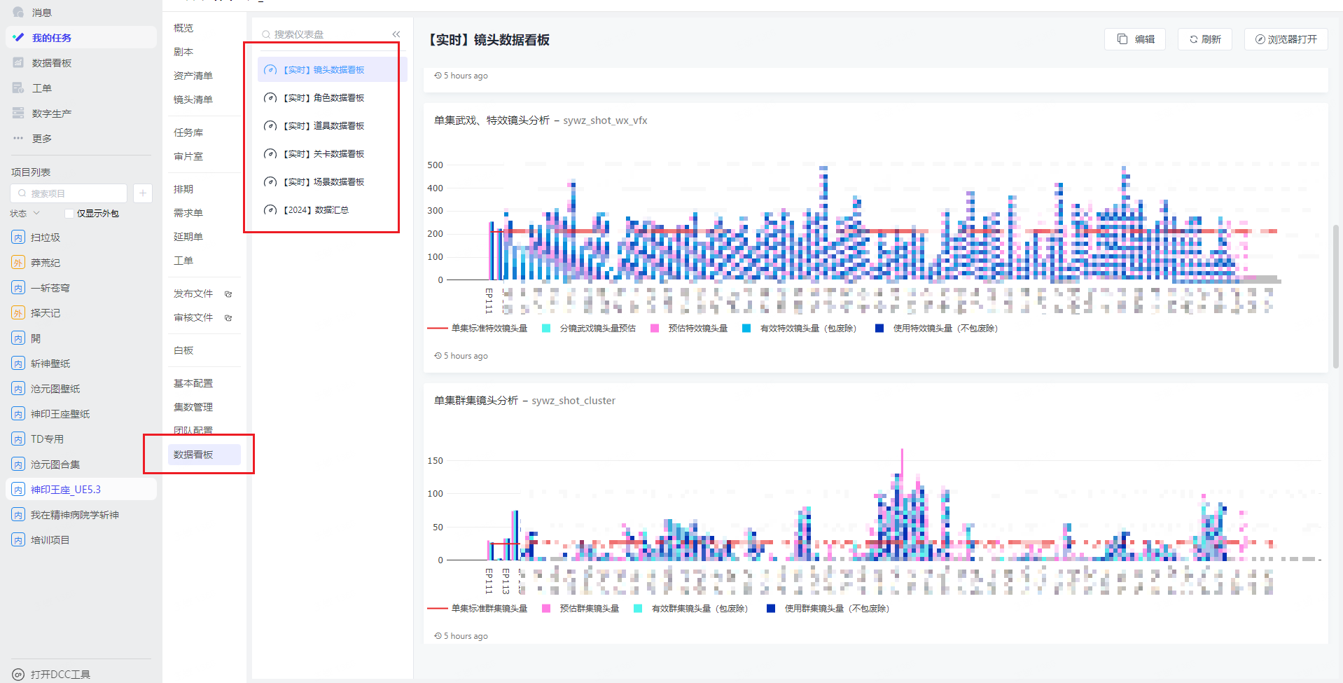 依托项目沉淀的统计数据,我们可通过数据看板直观呈现镜头、角色、道具、场景、关卡的全维度数据指标,为项目精细化管理筑牢数据支撑、提供科学决策依据