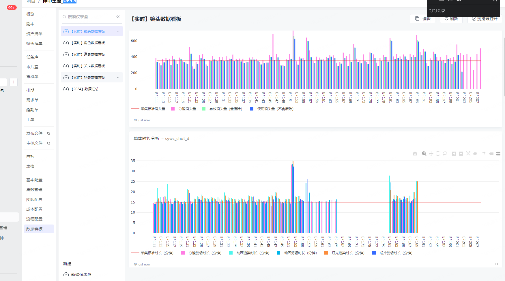 依托项目沉淀的统计数据,我们可通过数据看板直观呈现镜头、角色、道具、场景、关卡的全维度数据指标,为项目精细化管理筑牢数据支撑、提供科学决策依据