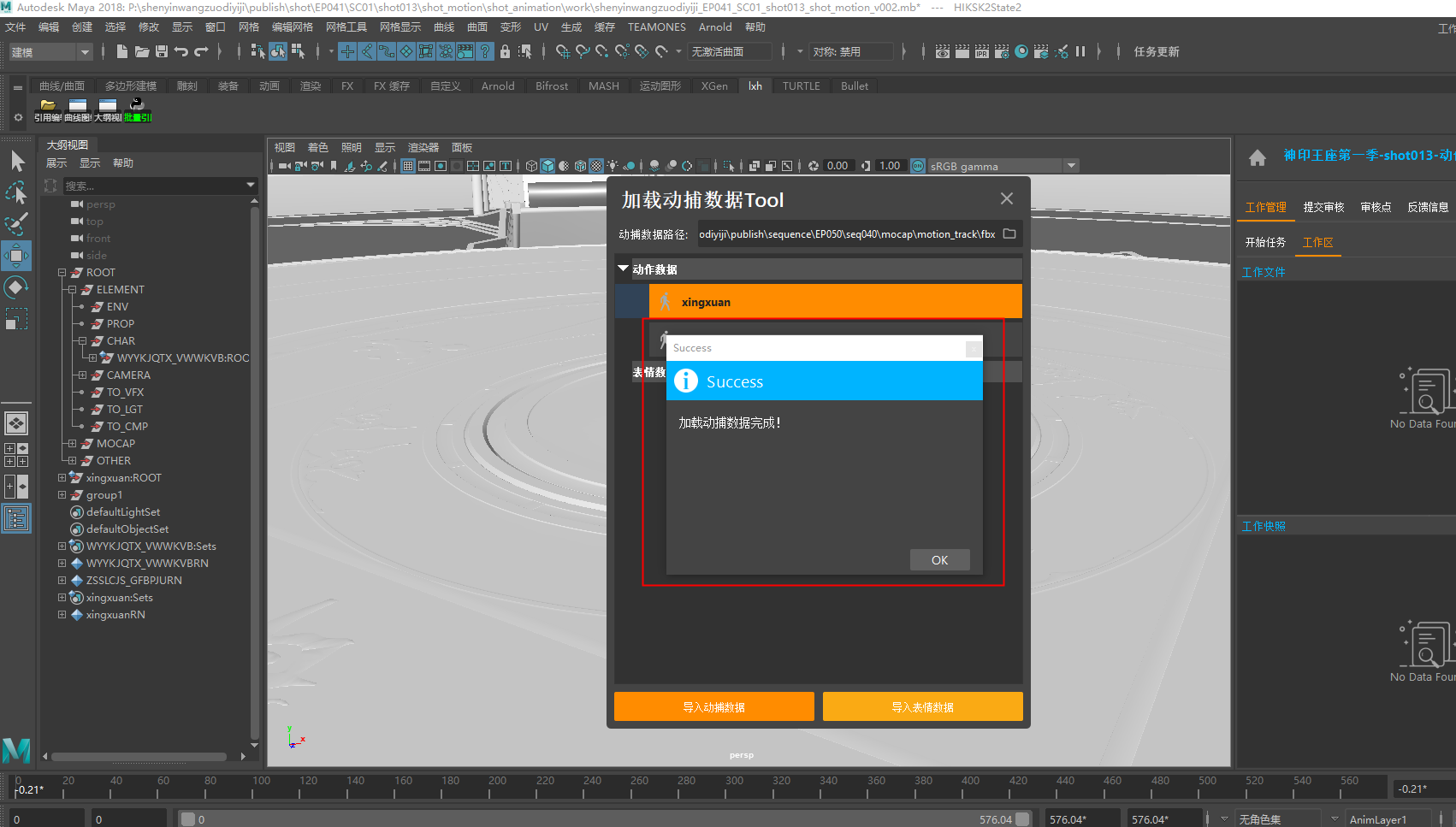 开始传递数据。出现加载动捕数据完成时表明 数据已经加载完毕