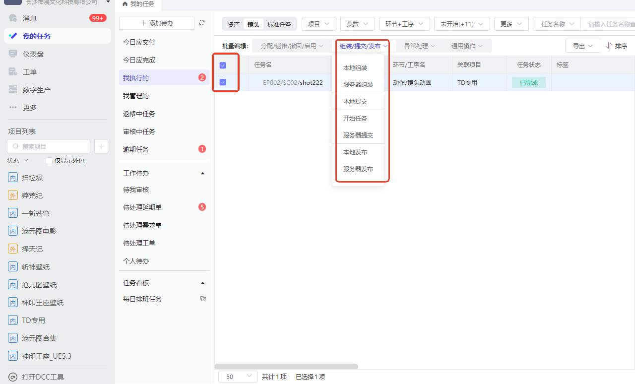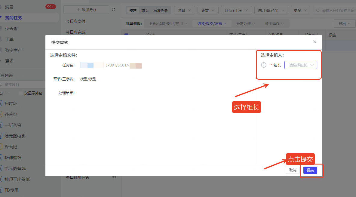 点”组装”启动软件开始任务,点击“沟通”按钮,会自动创建制作相关人员在内的聊天群,比如制片,上下游部门负责人。