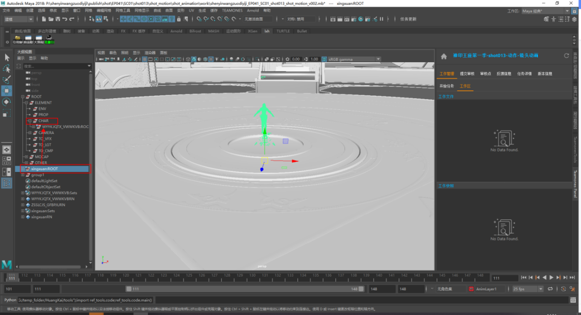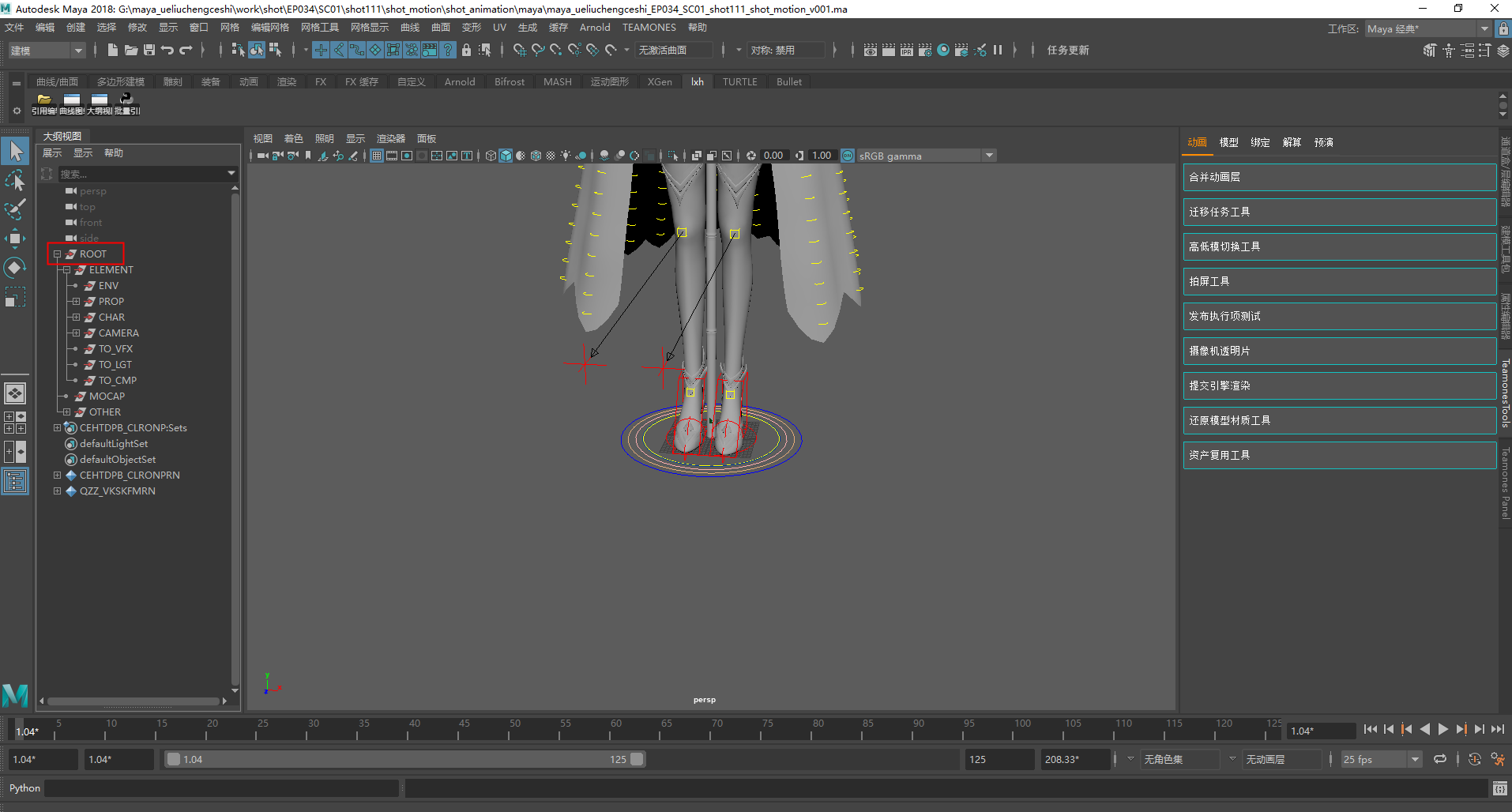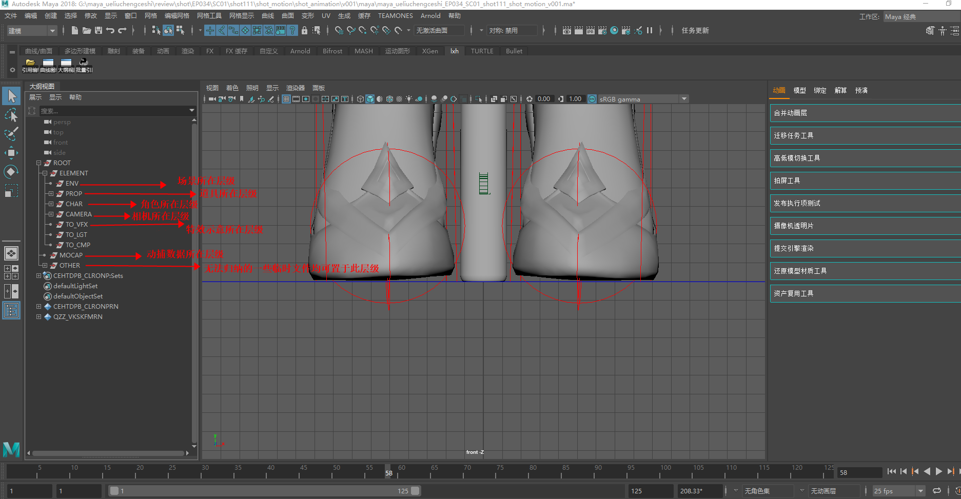 大纲里的“ROOT”组,把模型按组分类,场景在“ENV”里(但是为了避免打开任务时加载时间过久,一般场景我们没有放置在”ENV”里面而是放置在ROOT外面);道具在“PROR”里;角色在“CHAR”里;相机在“CAMERA”里;动捕数据在“MOCAP”里;需要导出给特效部门用的特效示意物体,放在“TO_VFX”里;其它各种示意或别的东西,都放在“OTHER”里。