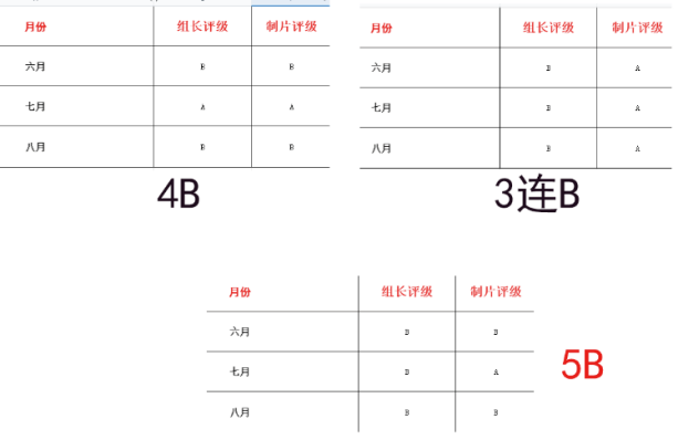 1组内评分如果连着3个月都出现B或者出现4个B组长会抓组员谈话考虑降薪或者走行政流程。 5-6个B就直接走行政流程(三个月会有6个评级)