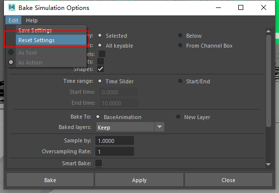 烘焙动画属性设置,默认属性就行,切记不要选Below(下方),不然控制器下面的所有层级都会被烘焙上帧,可能会导致控制器失灵的情况。