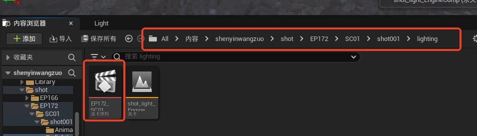 d. 在内容浏览器里找到刚刚组装好的镜头,点击关卡序列