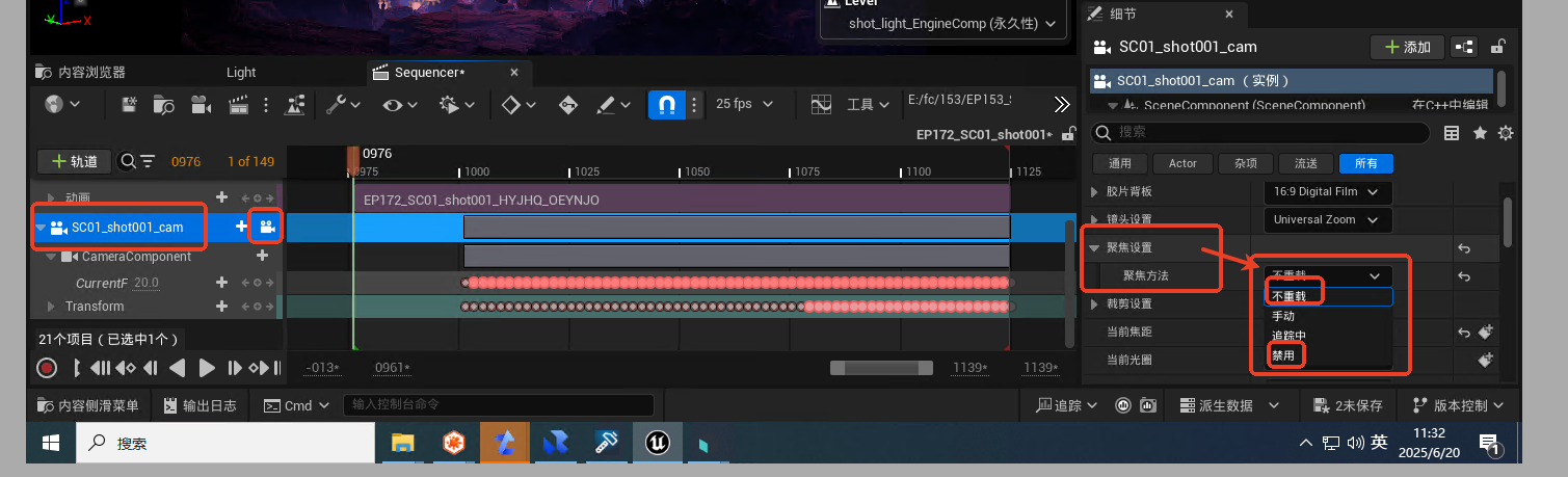 e. 找到摄像机,找到聚焦设置——聚焦方法选不重载或禁用