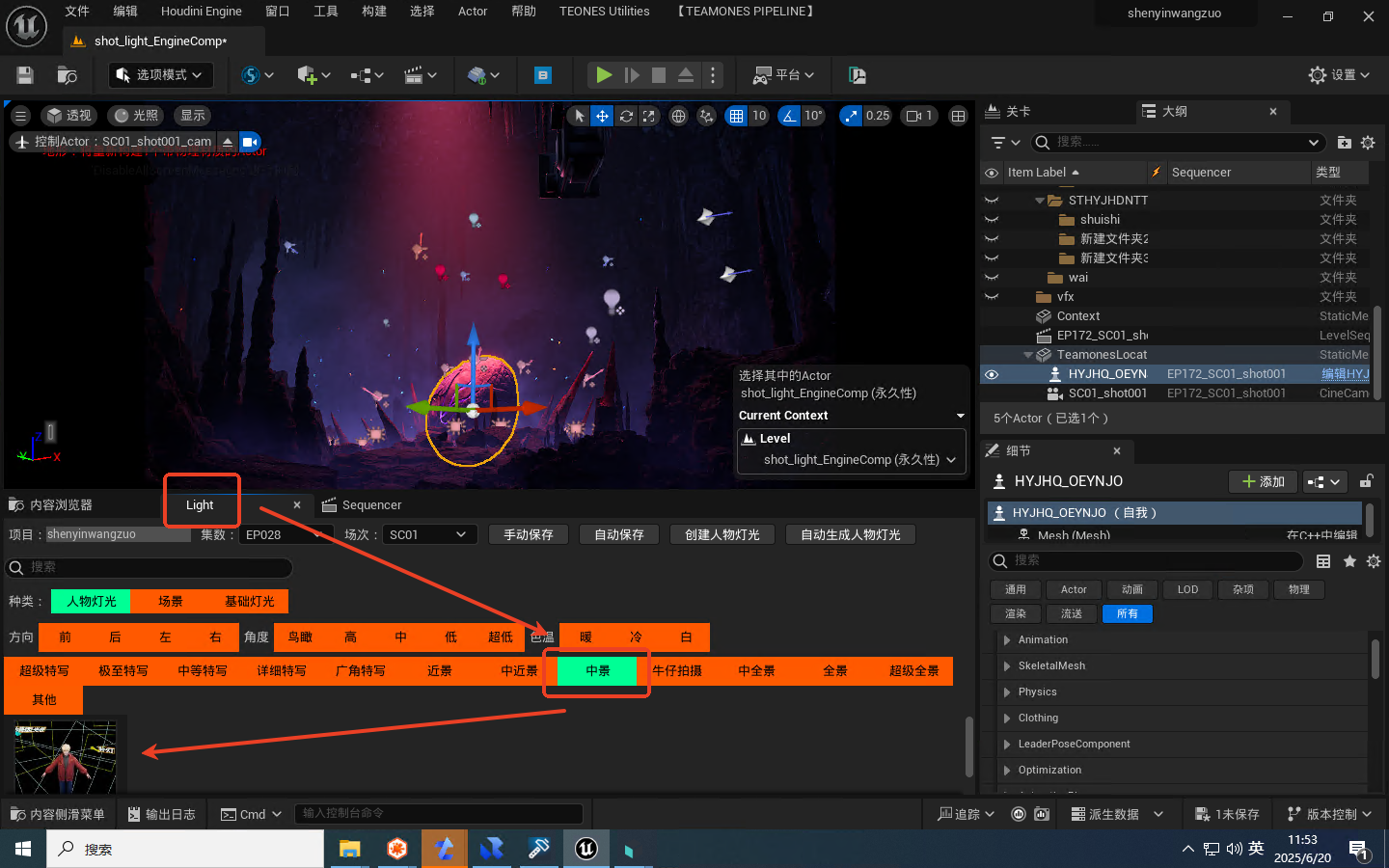 f. 打开灯光模板页面,选择需要使用灯光模板,选择使用打光的角色,双击模板打光