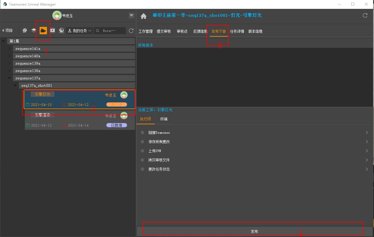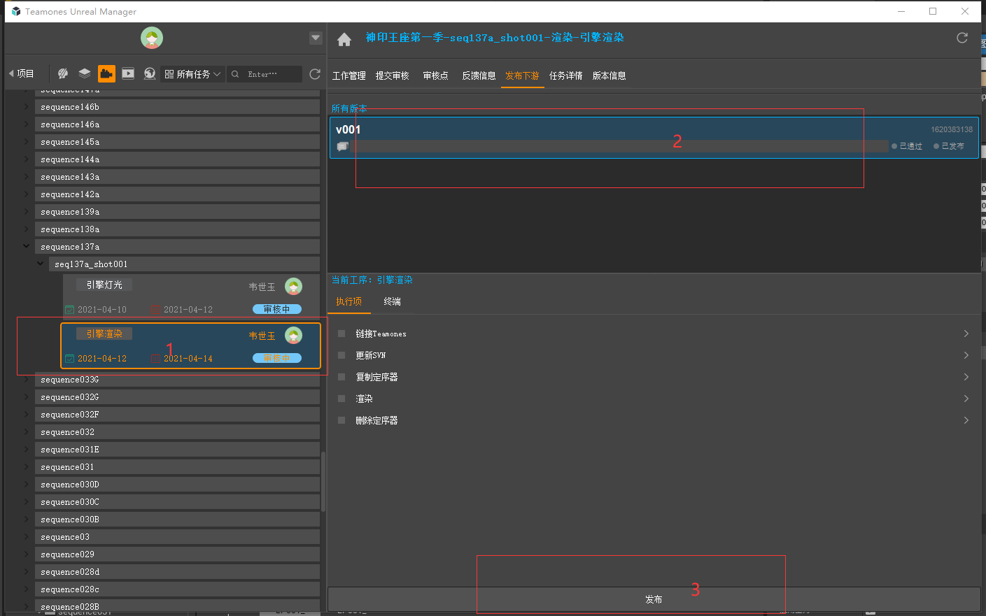 - 最终渲染:在收到特效更新并且确认最终效果后,灯光需要再次提交审核,提交审核成功之后,选择发布下游中的最新版本,点击发布。