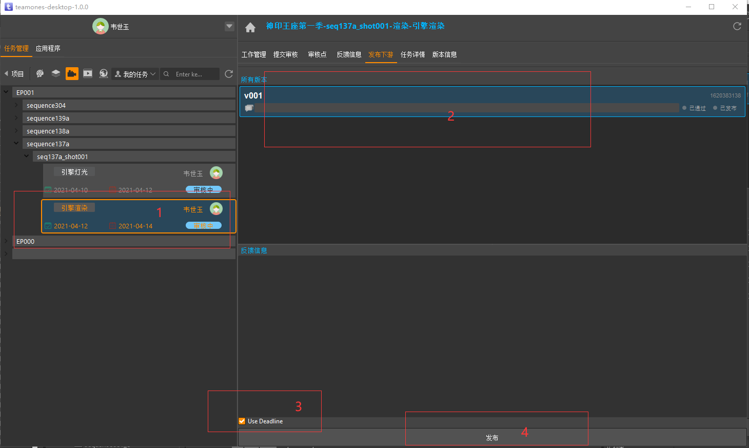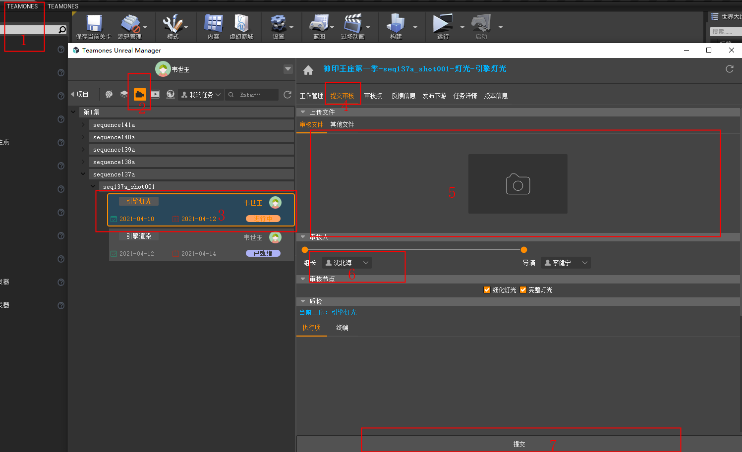 单帧效果通过后,在Teamones中选择发布下游,提交给后续引擎特效环节。