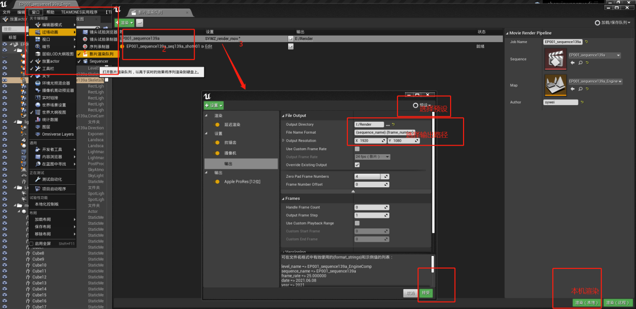 10.输出标准:正常标准输出mov.格式,AE特效需求输出MOV.格式,交付特效镜头上传SCM工程。文件命名为后台自动创建的定序器命名,帧速率25帧,注意检查前后镜头效果是否接镜,材质是否表现正常,毛发,布料是否穿插,角色是否浮空。