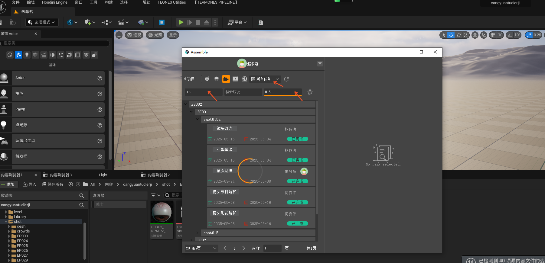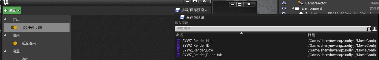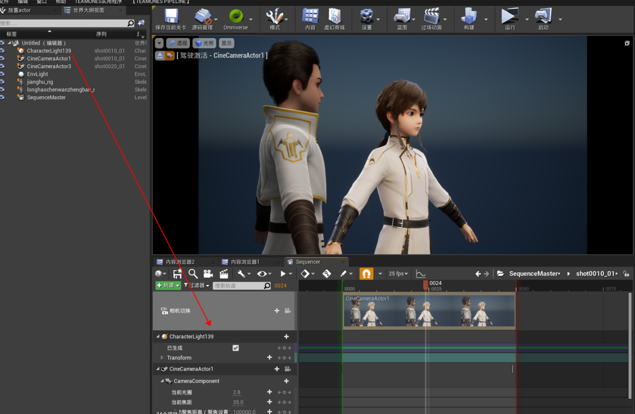 4.检查动画:打开关卡里的定序器进入相机模式,查看镜头动画是否跟动画拍屏一致,查看多定序器时动画是否正确,注意穿插浮空等问题。