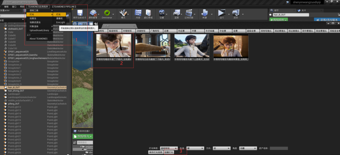 6.灯光制作:打开镜头动画无误则开始进入灯光制作,打开Teamones灯光插件,根据组长提供的灯光氛围参考,使用预设好的灯光模板制作镜头灯光效果。