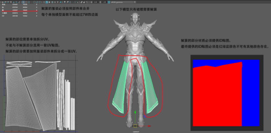 解算的部分需要按照服装部件来拆分成一张UV。(解算面积过大可分为多张UV)