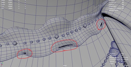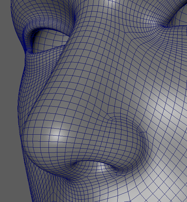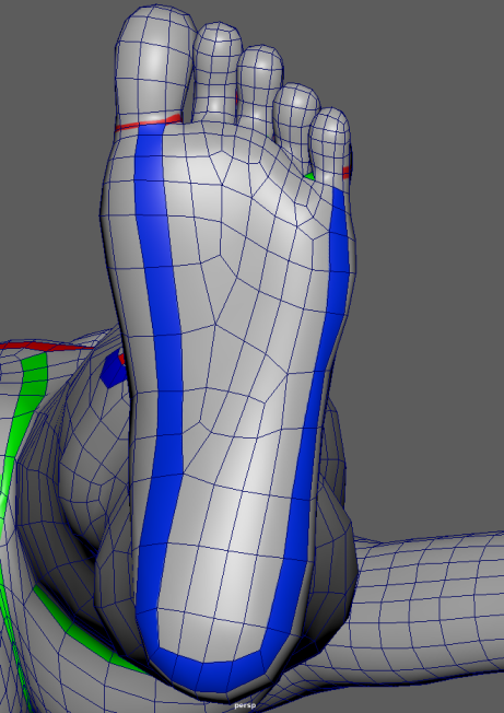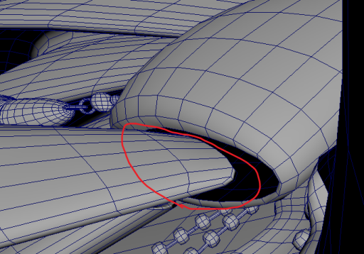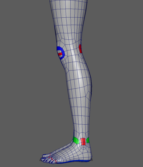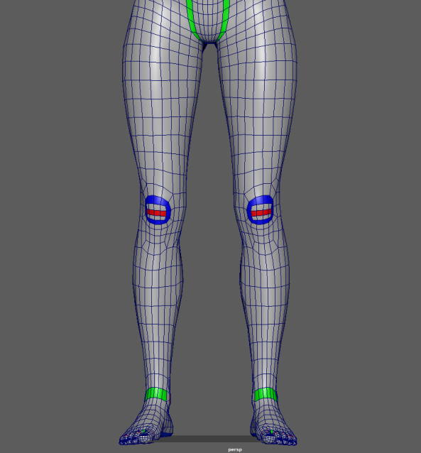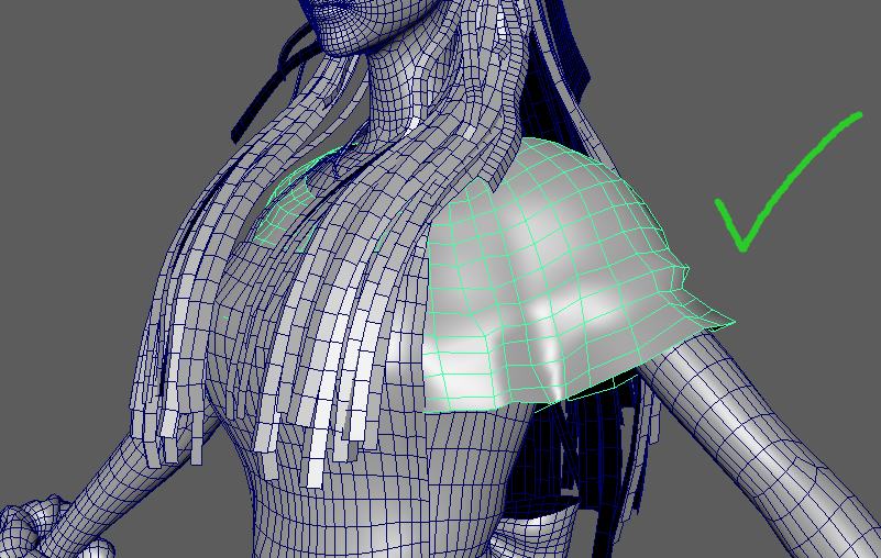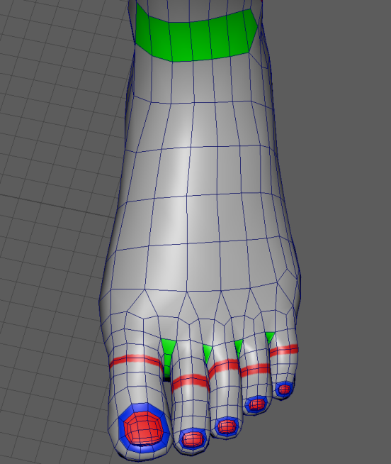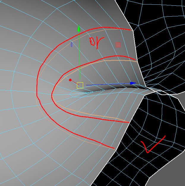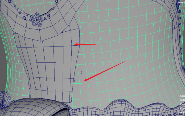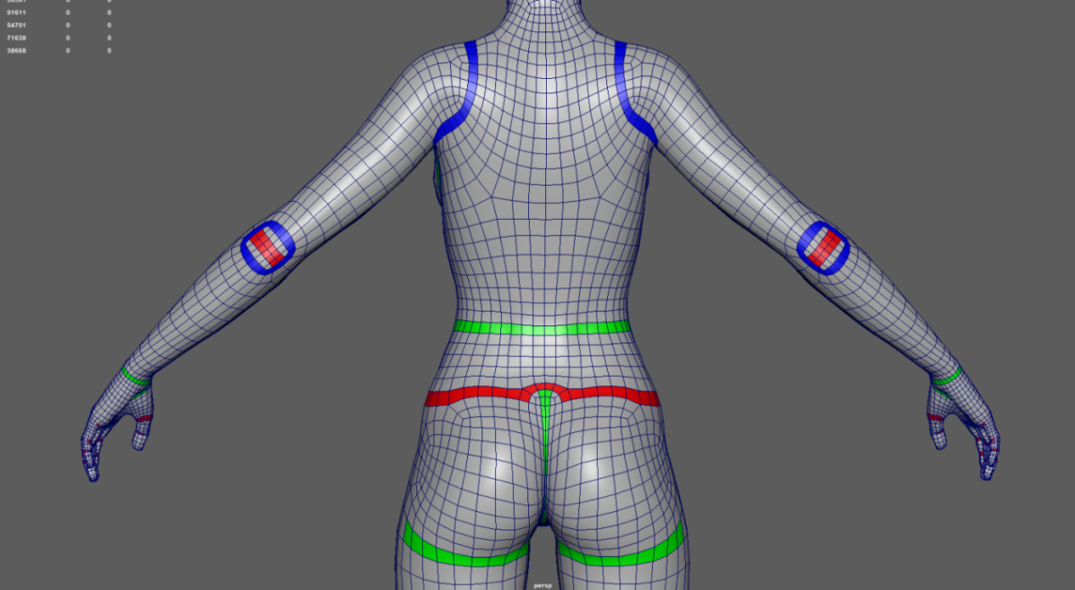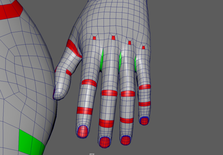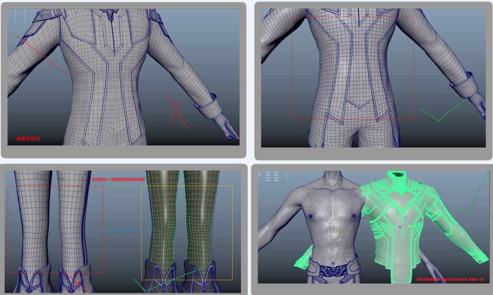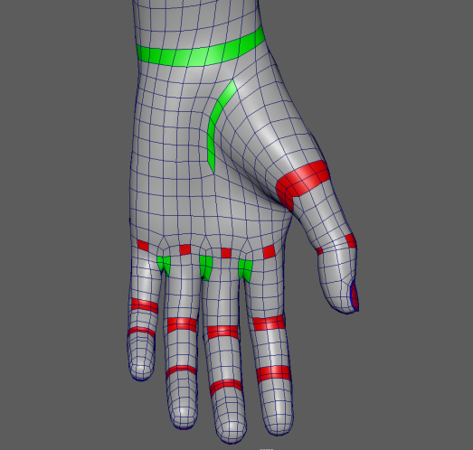 需要做大幅度弯曲或旋转的部位要布线充足,以保证绑定和动画的要求,关节处的布线,横平竖直,不能出现五星点。