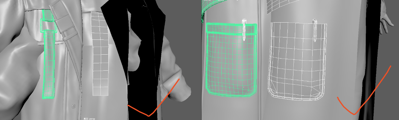 服装的配件要与服装表面紧密贴合,并且做出厚度(再薄的东西都是有体积的),边缘要导角卡线,以保证该物体结构清晰。