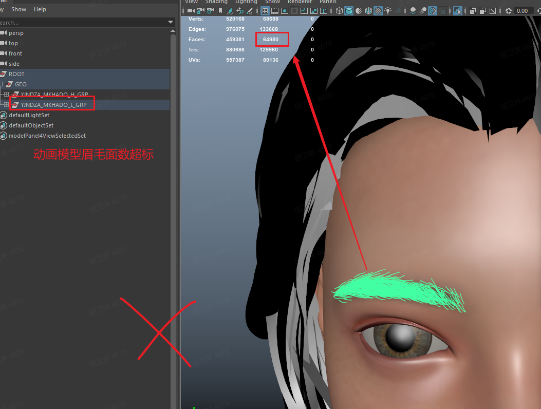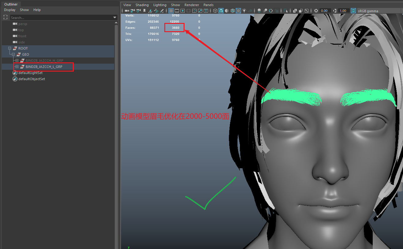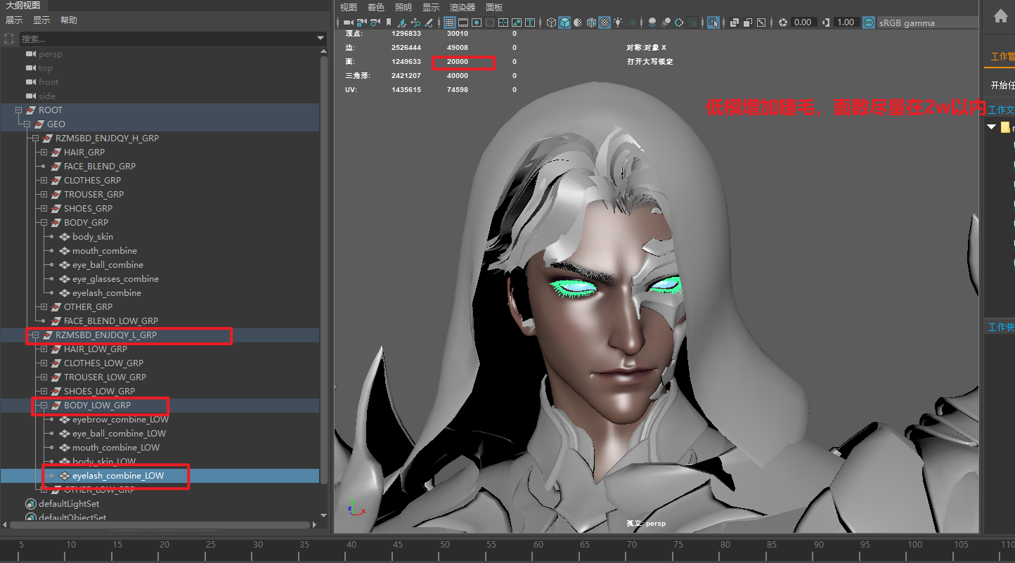 动画模型眉毛面数要优化(2000-5000面左右)保持好高模的轮廓