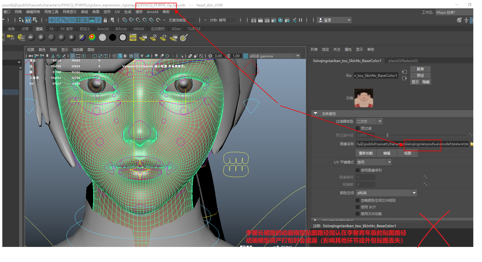 面部皮肤贴图需使用对应角色服务器发布路径里的脸部贴图,贴图为512的tga文件。如果是按标准流程组装打开的动画模型会自动继承上一步材质贴图发布后压缩的512贴图文件,如果是使用外包制作的动画模型是没有自动连好512贴图的,需要手动到材质贴图的发布文件路径找到脸部512贴图链接好,装备可以不连贴图。总之最后提交时要保证角色的眼球和脸部的贴图都链接好且贴图链接路径是正确的。