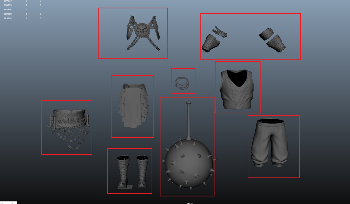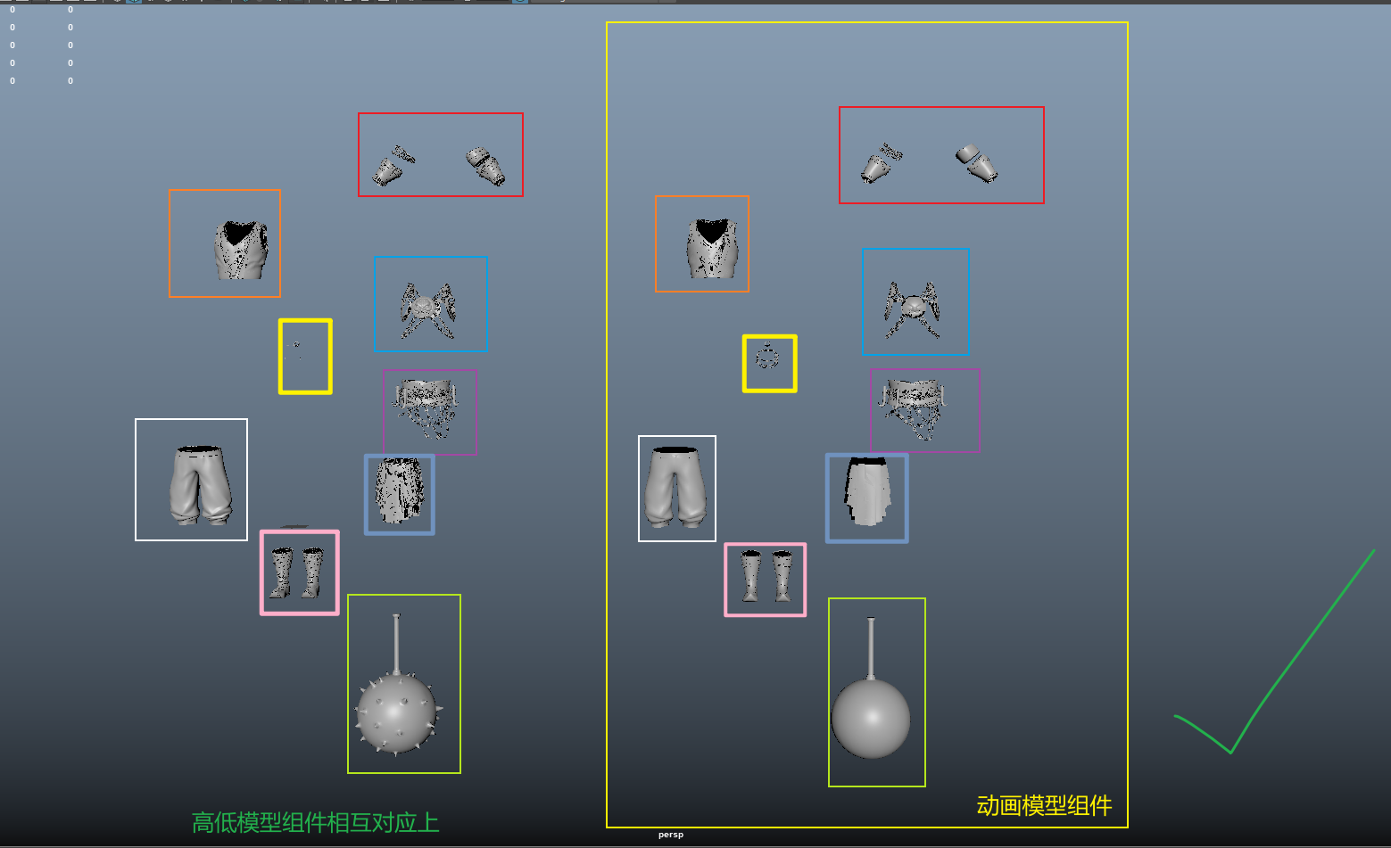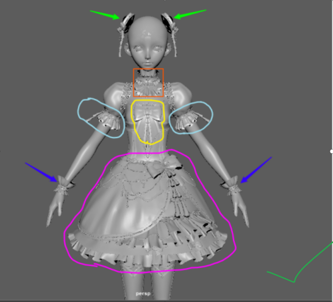 动画简模和布料简模使用同一个简模,所以需要同时满足动画和解算的规范。在做装备的动画简模时会提供原画的解算指定图,原画标出的所有需要解算的装备都需要用单面制作(既所有需要解算的物体都不需要做出体积,包括吊坠等物体都用单面制作),以下是动画和布料简模标准案例: