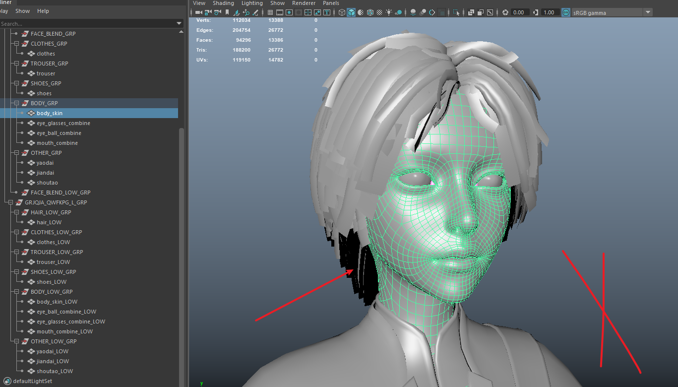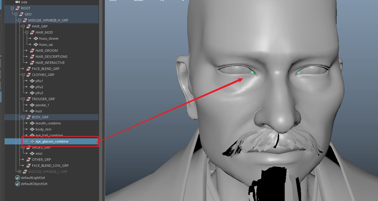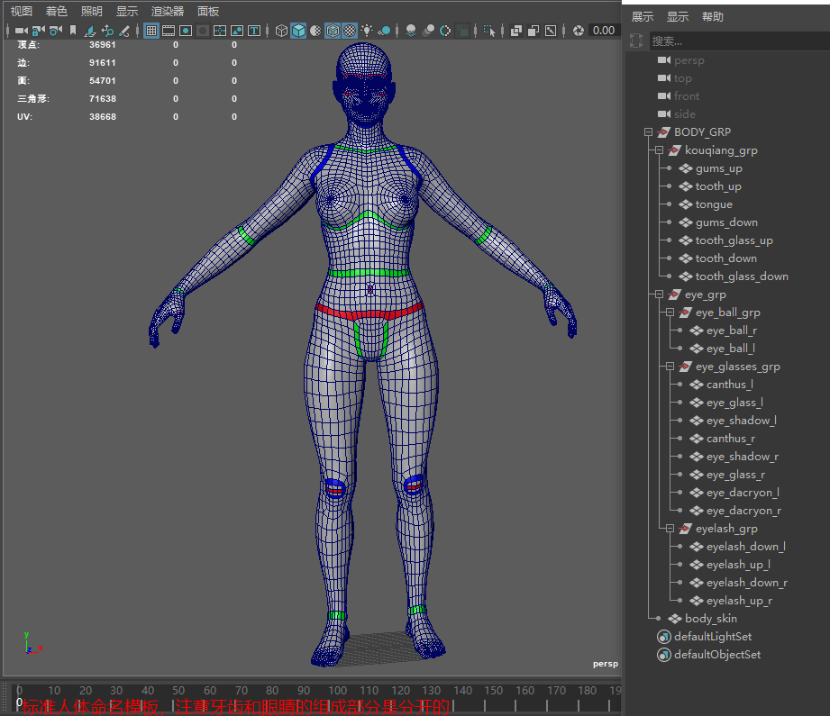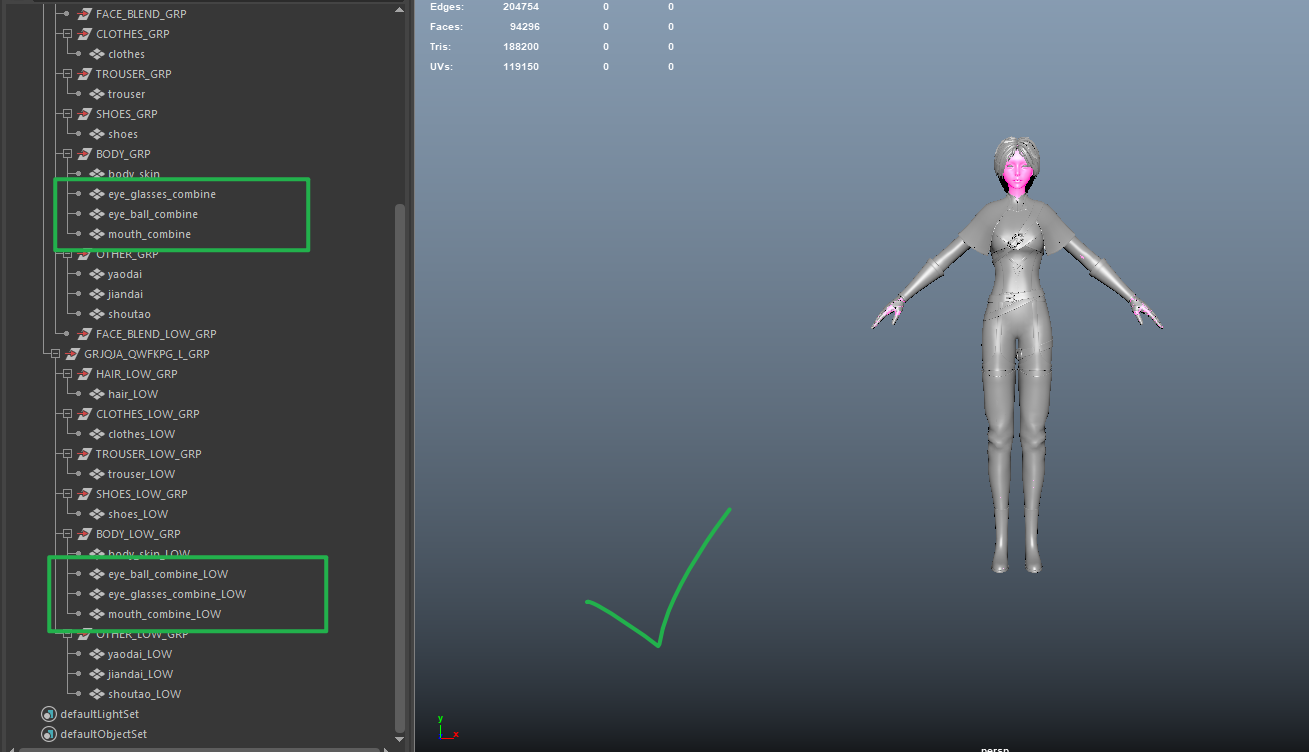 动画模型后缀要手动添加_LOW,动画模型的大纲层级和高模一一对应(眼球,口腔,xgen毛发除外)