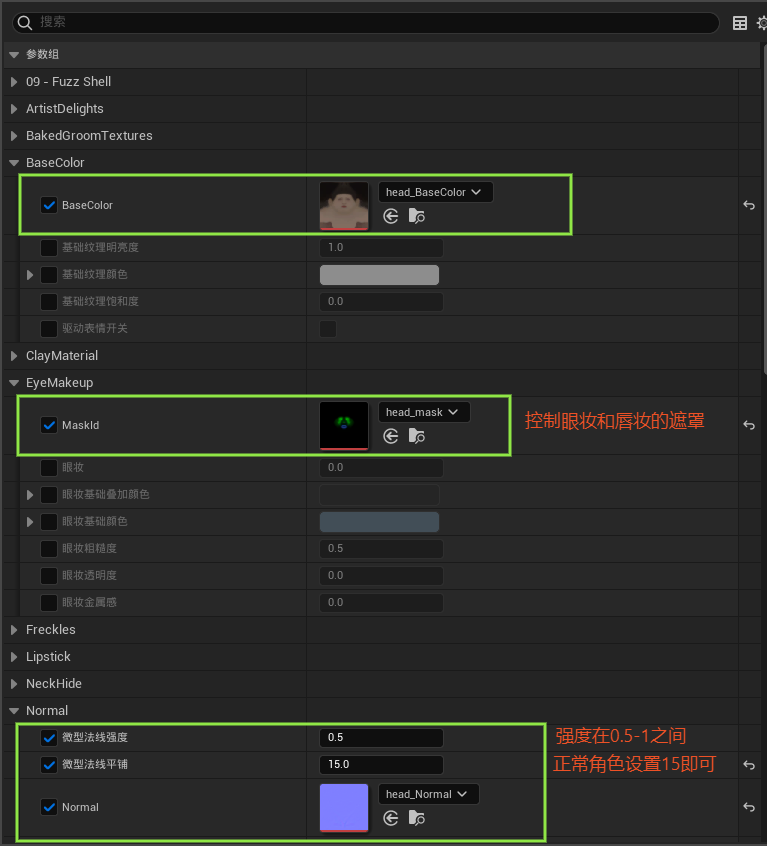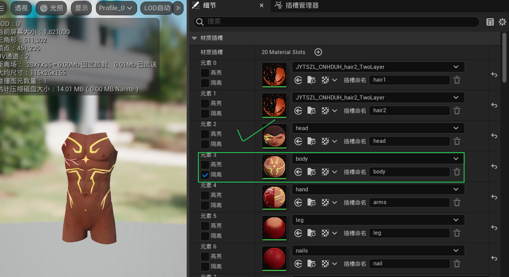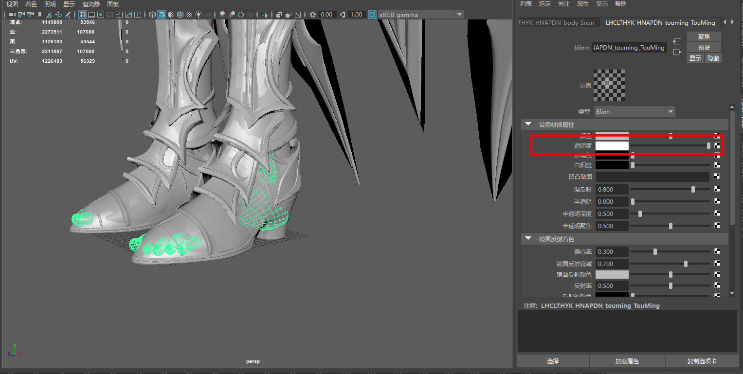 补充:身体裸模与装备有穿插的地方需要赋予touming材质球(高低模分别赋予)并将材质求参数调整: