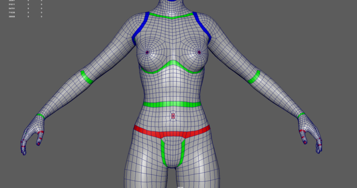 身体布线拓扑模型的布线结构要按照雕刻的结构来布,并注意为关节处的布线,横平竖直,尽量不出现五星点,以方便绑定环节的权重设置。
