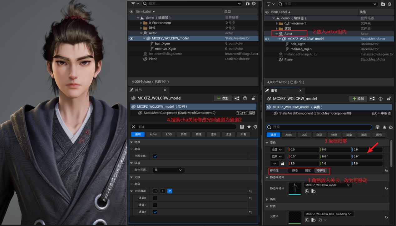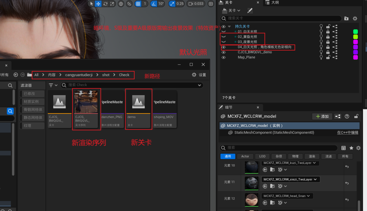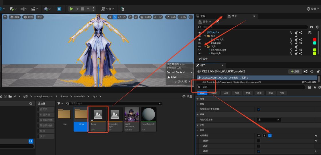 打开标准关卡,放置资产后位置归零,在关卡(窗口栏目可以打开)开启day关卡关掉night关卡,晚上环境相反