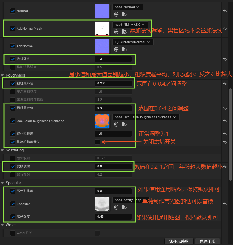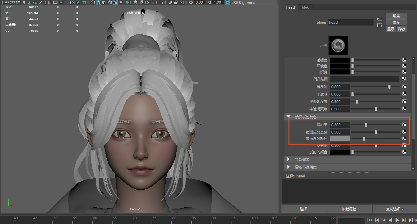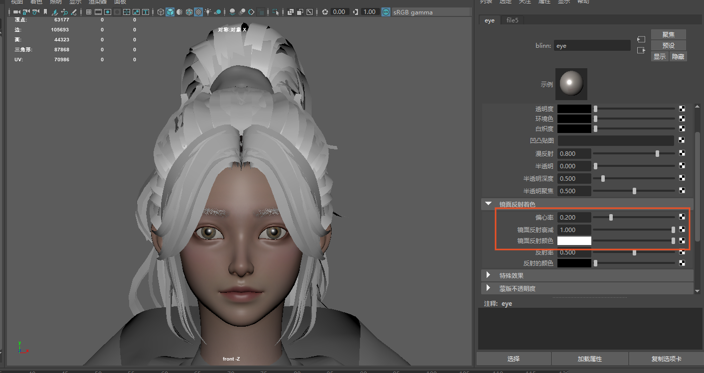 眼球和面部贴好贴图后需要把材质球的高光调整到合适的范围,标准如下
