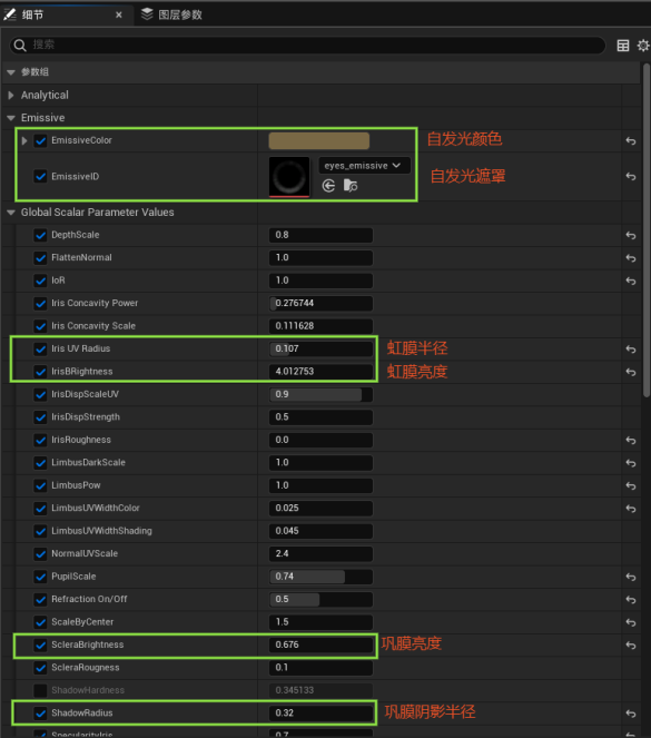 眼球参数 偏心率:0.2 镜面反射衰减:1.0 镜面反射颜色:H 0 S 0 V 1.00
