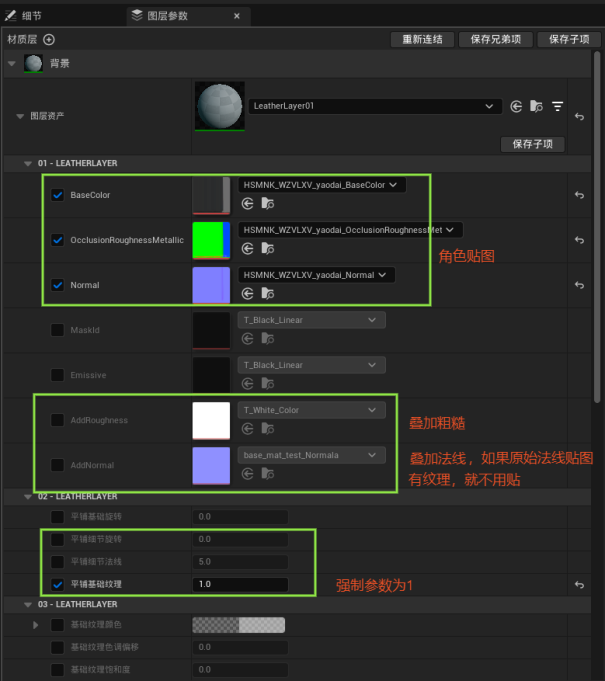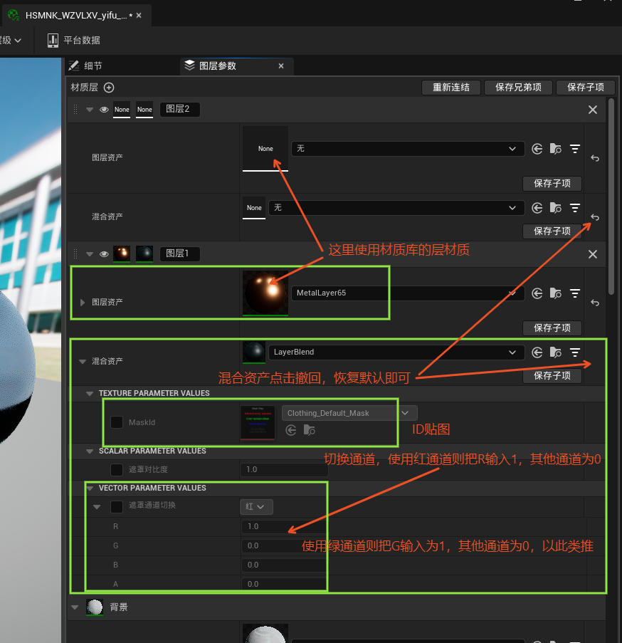 如果同种材质上有不同质感的物体需要去表现(例如鞋子整体分了一个材质球,鞋带、金属环、鞋底等区域的质感需要区分,在原贴图使用单层材质表现不好的话,可以使用多层材质来开调整),背景层不需要贴ID,包含背景最多使用4层材质