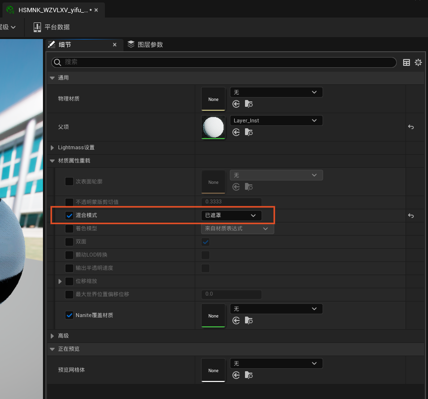 如需要使用透明贴图,需在材质细节的混合模式内修改为已遮罩