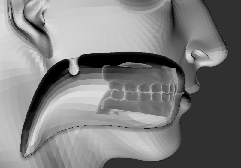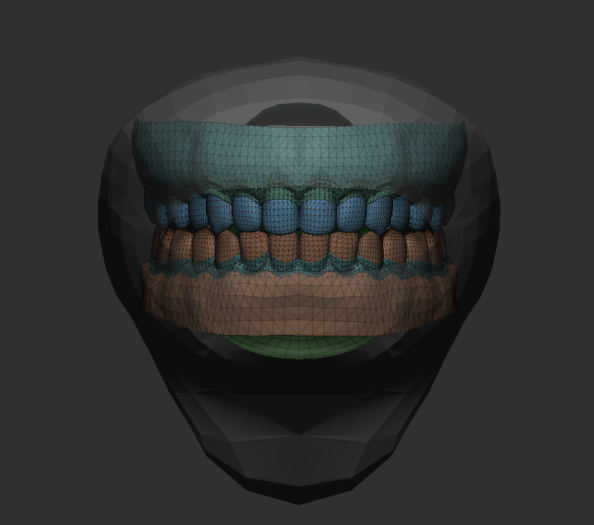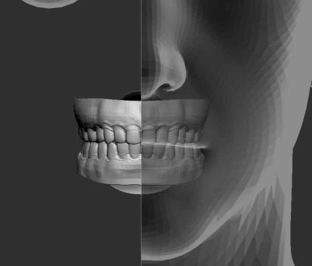 眼睛包括:眼球、眼睛四件套(即:遮光片、泪腺、眼角肉、眼角片),遮光片匹配好后smooth一级。牙齿要与口腔匹配到位,要完美包裹牙齿,眼皮要包裹着眼球。让眼球跟内部的眼皮延长线尽量贴近。