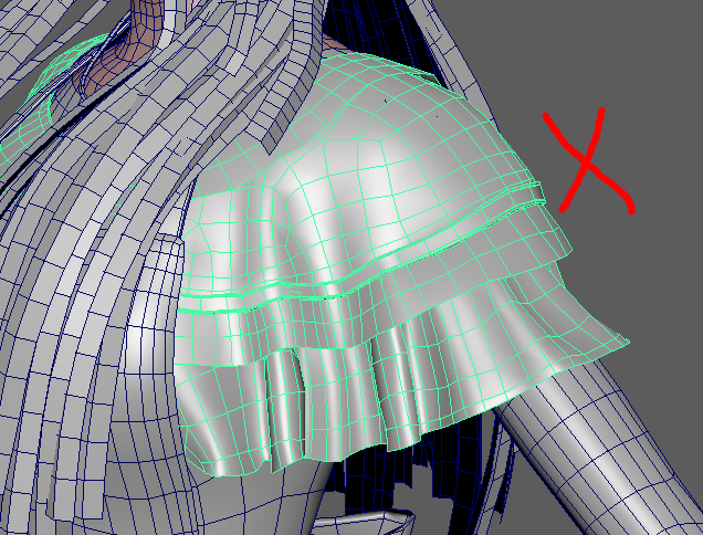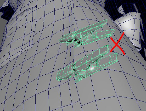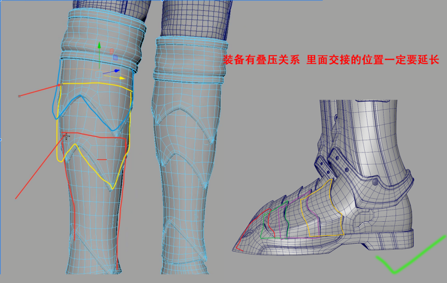 动画模型-护腕-肩甲-胸甲-腿甲-鞋子-腰带-尾巴触角等物体一定要跟原物体一样有厚度 能包裹住原物体的形态轮廓,不能只是一个单一的片状,如图错误示范