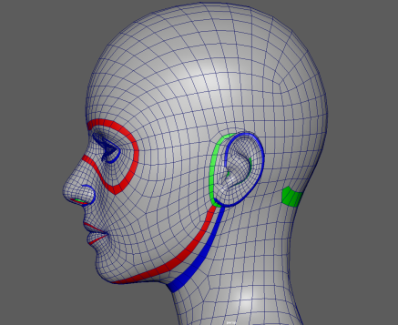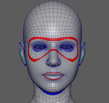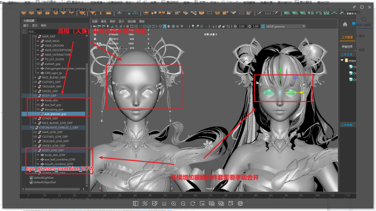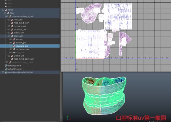 动画模型需要增加眼睛四件套以及口腔模型且手动合并,遮光片要单独给透明材质,动画模型需要流向下游部门,需要严格检查动画模型规范,特别是与高模的匹配和布线。如图