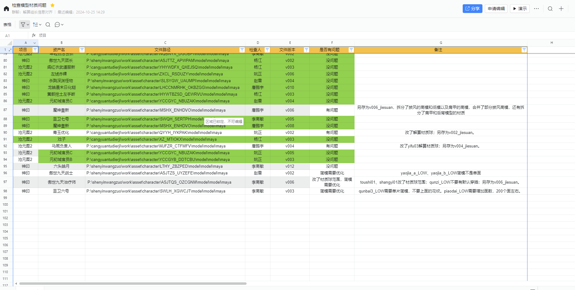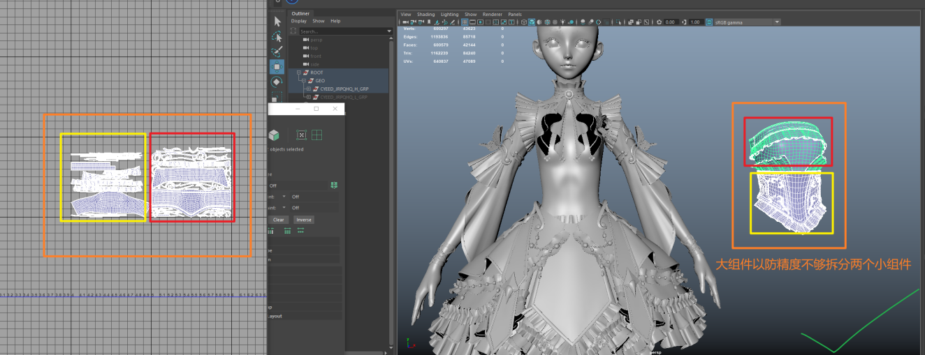 制作人员把模型整合上传完成后,我们把模型发给解算组协助检查材质范围,解算组会在我们的文件上把解算拆分有问题的模型拆分,最后反馈到制作人员进行修改。
