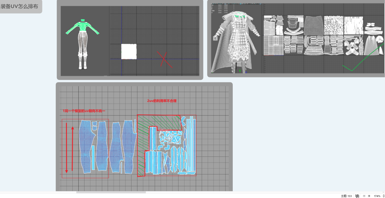 衣服和装备UV密度请保持基本一致,同一材质必须保持UV方向一致、大小一致且不能有UV拉伸(便于使用平铺纹理)