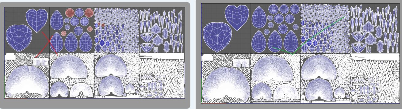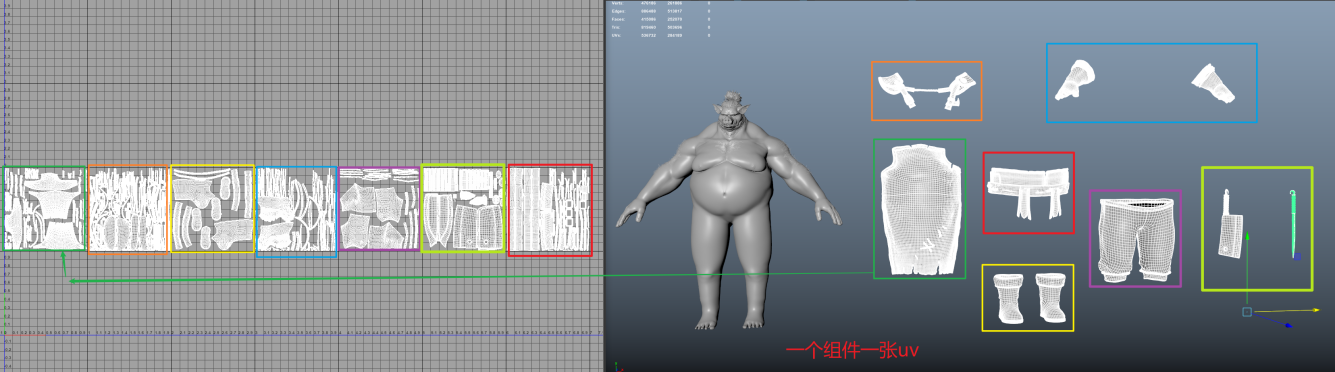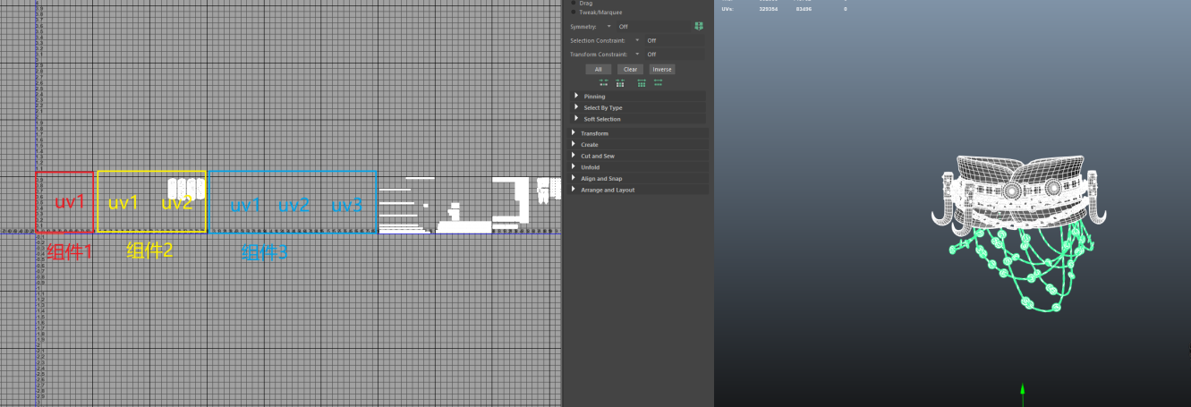 一个组件一张uv且同一个组件的uv要排列在一起(如图正确示范)