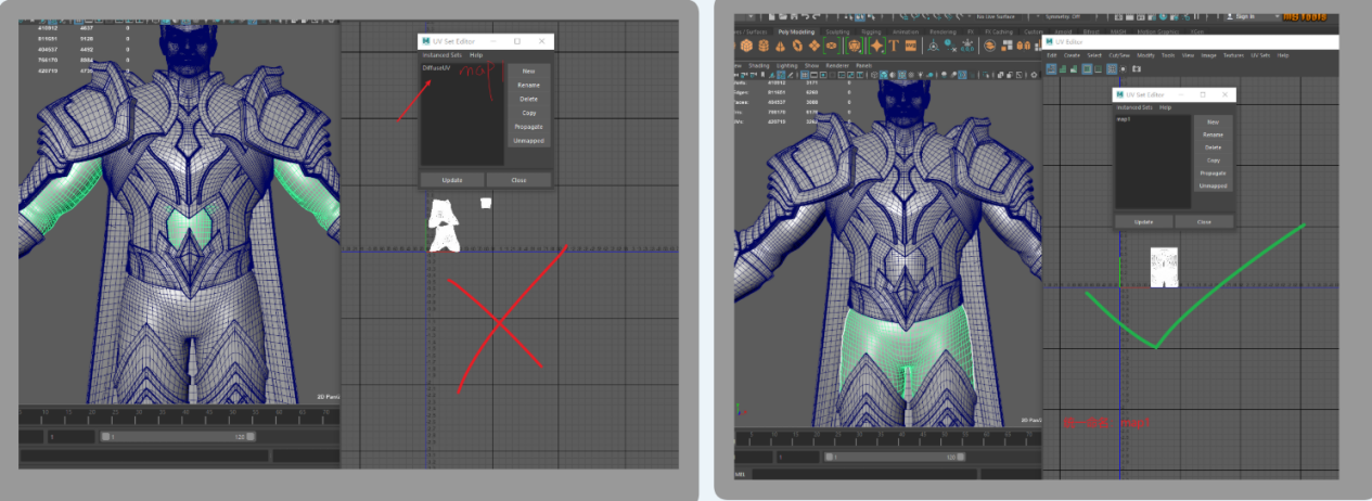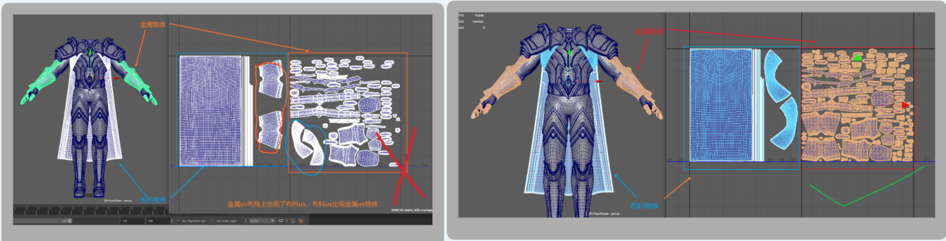 左右复制后的同一材质球物体的UV不能重叠,需要单独分离。(衣服装备)