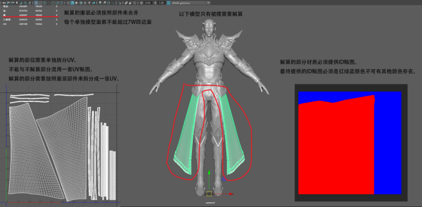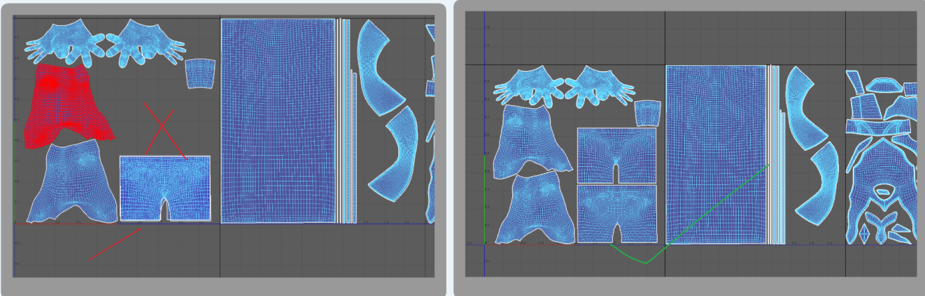 解算的部分需要按照服装部件来拆分成一张UV。(解算面积过大可分为多张UV)如图所示