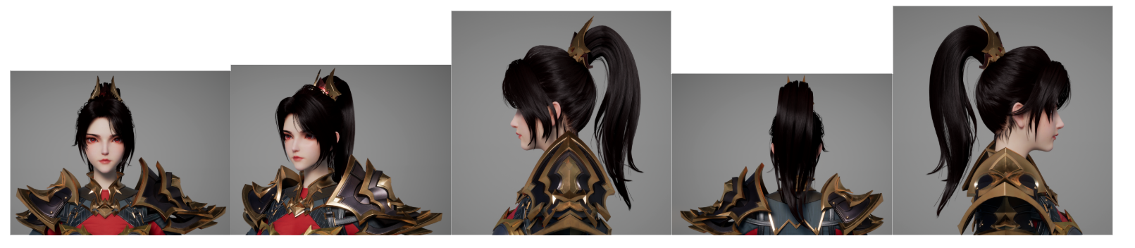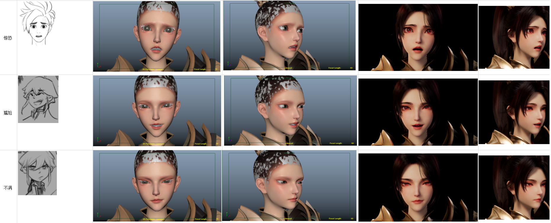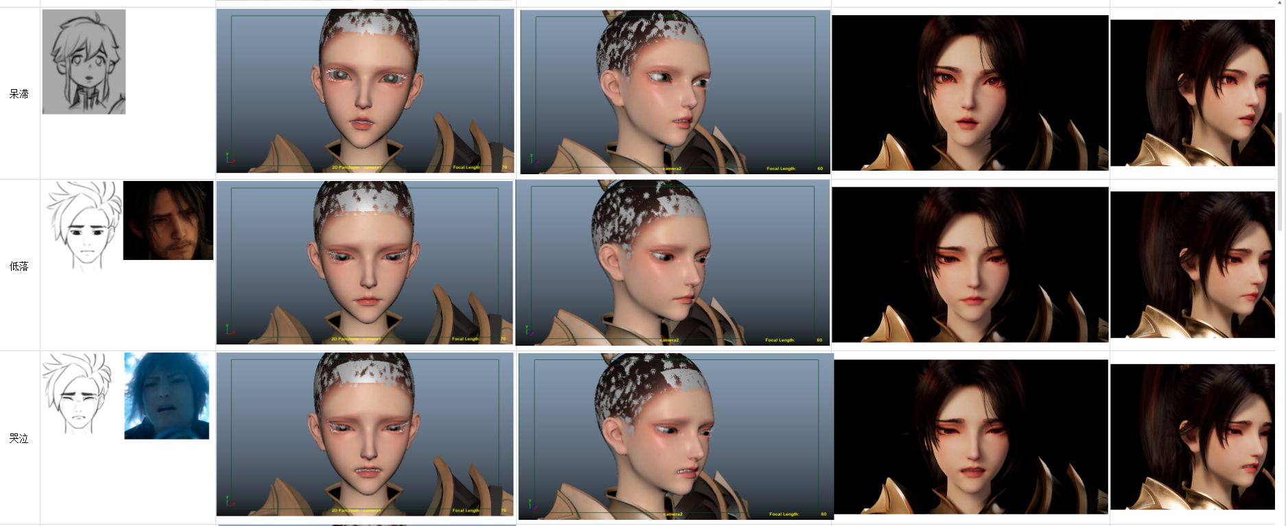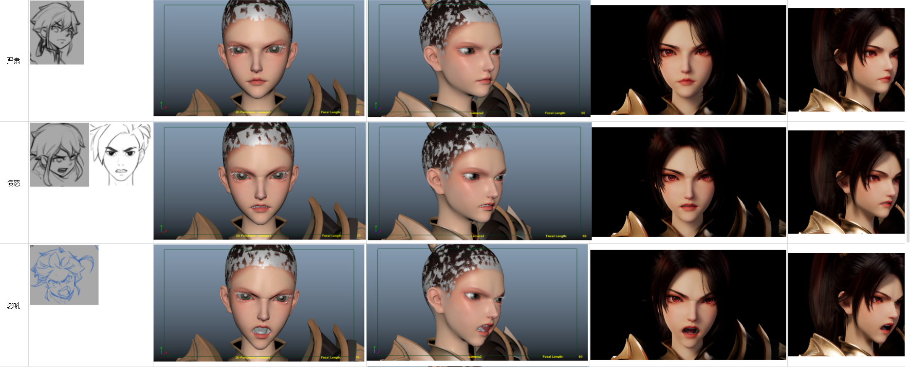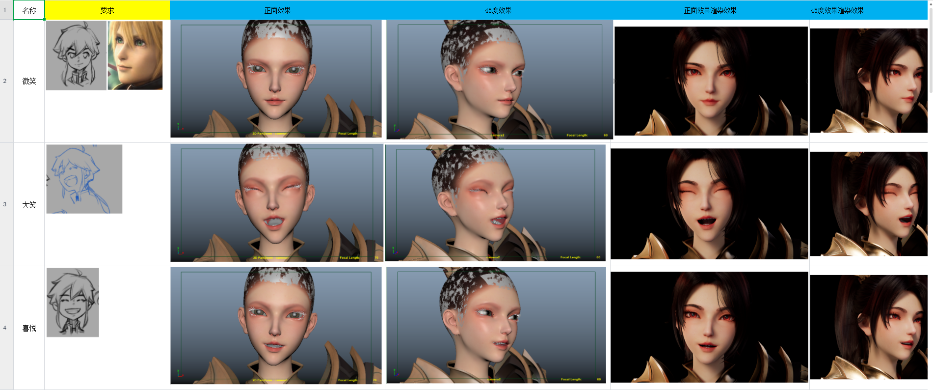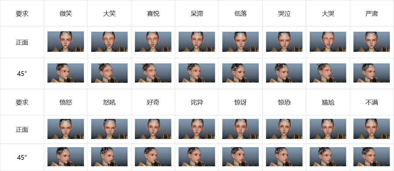 ①各种表情渲染单帧截图:正面、45°两种角度(与动画的截图一同形成对比表格)