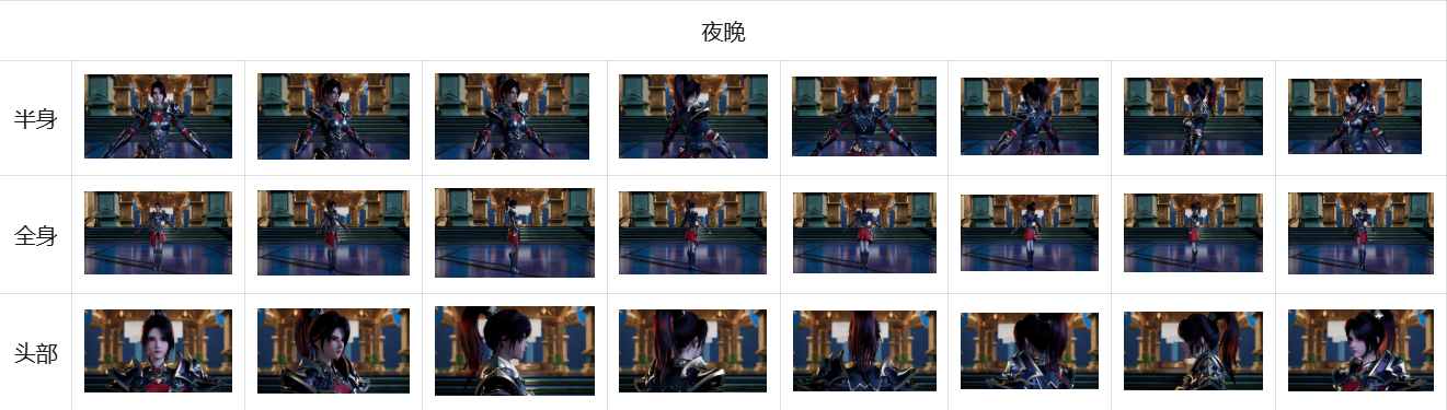 ②白天、夜晚、黄昏、清晨等环境下的局部特写单帧图(局部特写因角色而定)