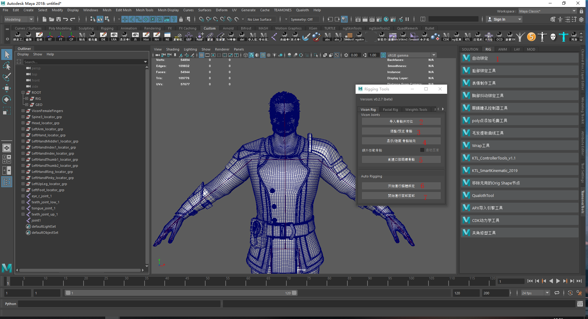 完全创建完骨骼和控制器之后,开始绘制权重。插件生成会默认带一个模板权重,需要根据具体角色去修改,接着把其余缺失的部件完成权重绘制。
