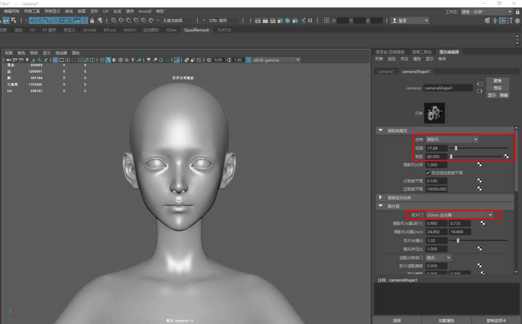 - 透视相机设置为maya和ue引擎相机保持一致,防止角色在近镜头时出现大的透视变形,Maya中相机设置:焦距:80胶片门:35mm全光圈范围。