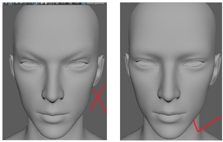 (2)侧面眼睛,下眼皮不能太过突出(如果按照错误的制作,闭眼时下眼皮会包住上眼皮)