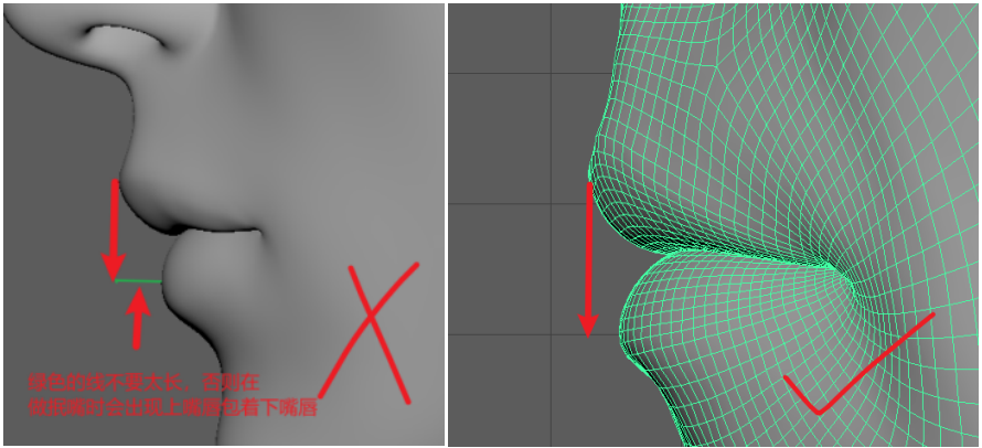 (3)嘴巴侧面看,下嘴唇不要距离上嘴唇太远(如果按照错误的制作,嘴唇会在错误的基础之上叠加效果)