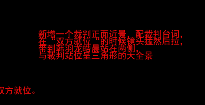 新增一个裁判正面近景,配裁判台词,在“双方就位“的时候镜头猛然后拉,带到韩羽龙皓晨站在两侧,与裁判站位呈三角形的大全景