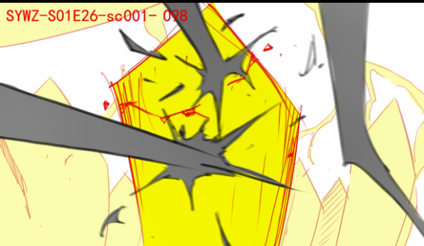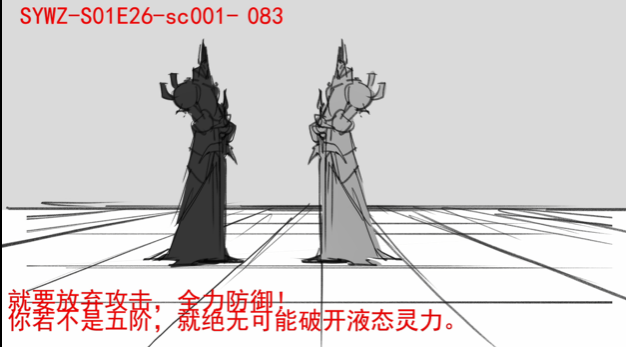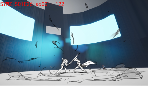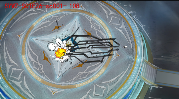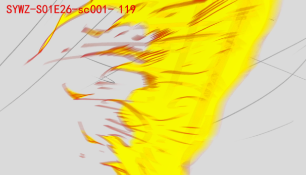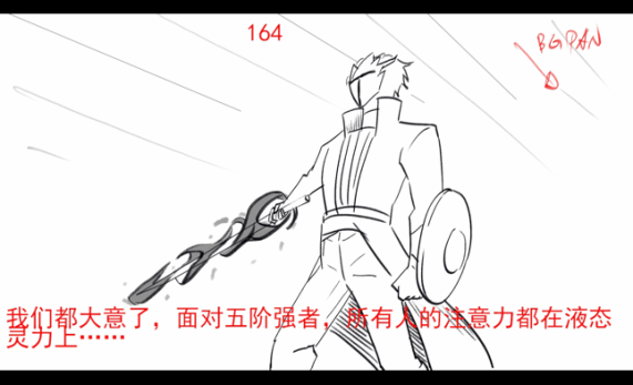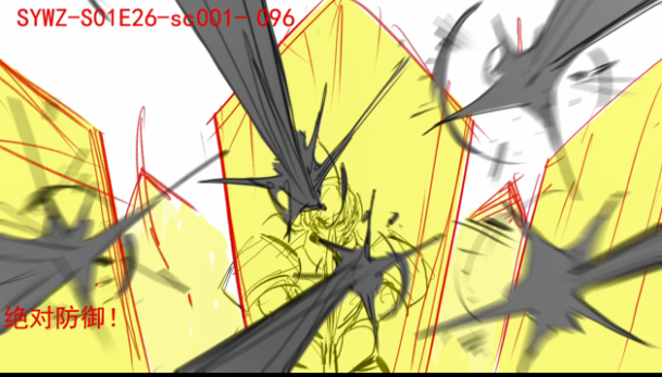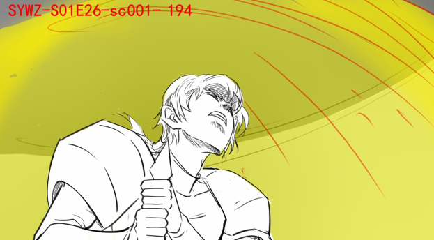 40,121镜头,韩羽的盾漏掉了黑金色液态灵力包裹的特效,可以从121镜头直接往后猛拉到122镜头,体现出巨大的光刃被小小的盾挡住的对比,现在的光斩剑太小,需根据之前的技能参考来调整光斩剑,