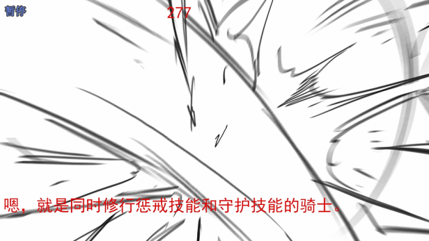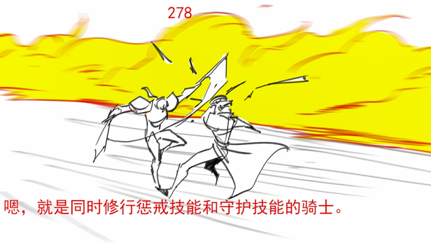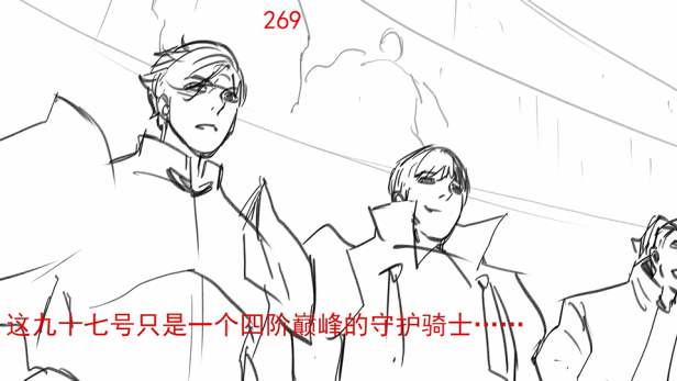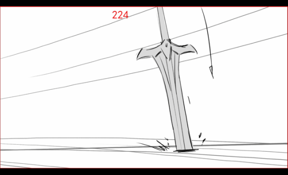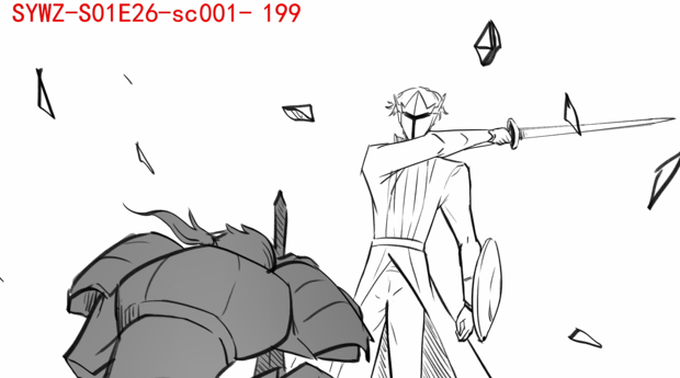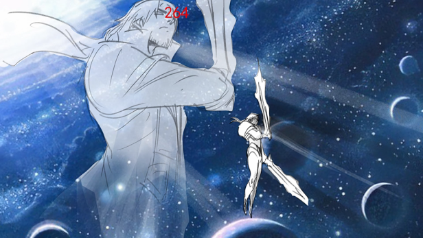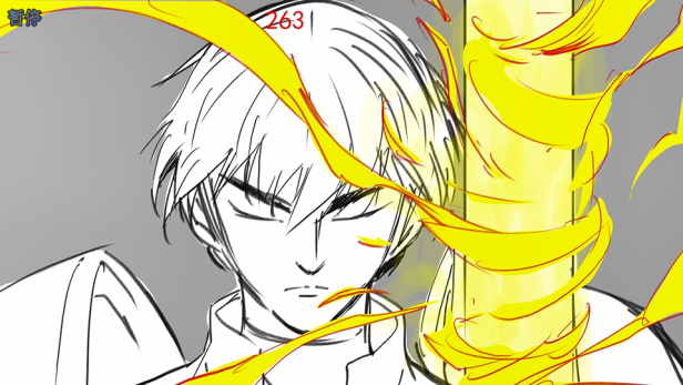在263-264之间需要有个挥舞的动作,让他从263的pose换到264,给个新的pose,圣剑在空中挥舞的时候需要带流光,让观众觉得很高级,现在的装逼不够,太静态了,缺少表演。