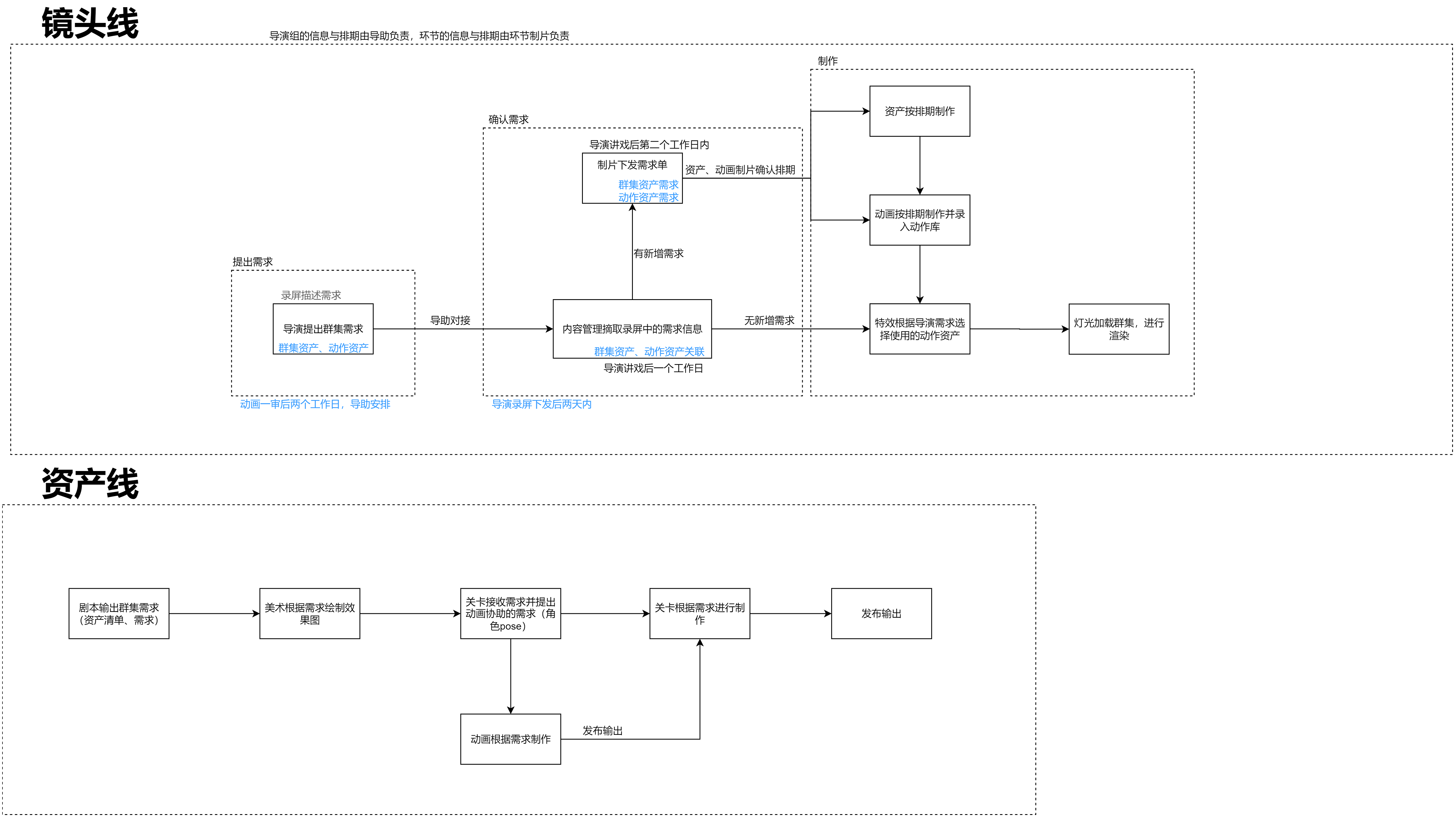 群集镜头需求由导演输出,制片通过需求单下发(镜头关联由内容关联进行关联,镜头关联动作资产);