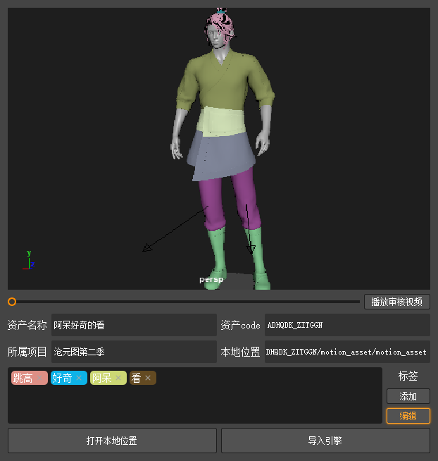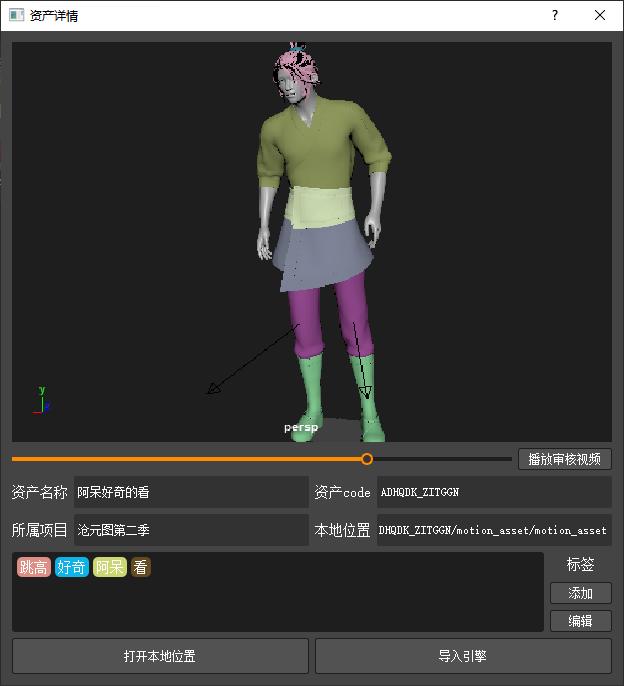 双击资产或右键菜单内选择显示详情可打开资产详情页面,此页面内可手动拖动进度条对动作资产的拍屏逐帧查看,同时点击进度条右侧的播放审核视频可播放高清的发布时审核视频;最下方的【打开本地位置】和【导入引擎】按钮功能与菜单内【打开文件夹】和【导入资产】一致。