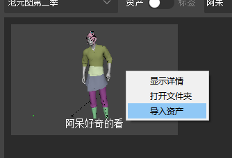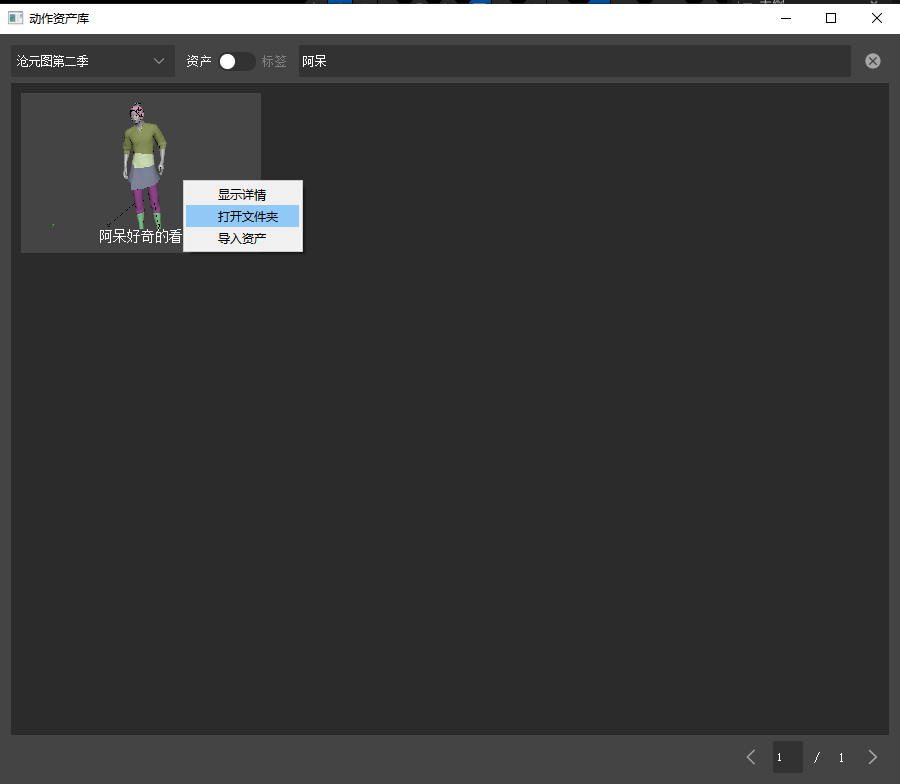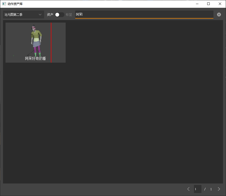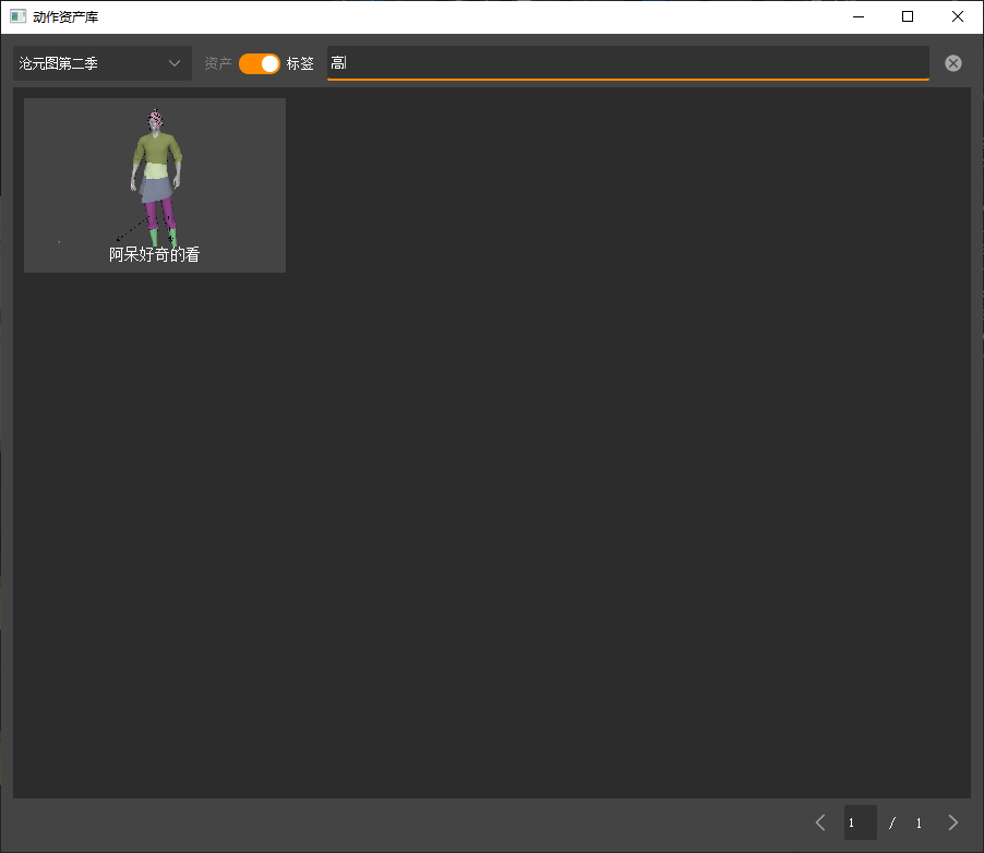 原本的搜索功能内,加入了标签搜索的功能,如【阿呆好奇的看】动作资产内绑定了测试标签【跳高】,那么可以用跳、高、跳高关键字查到此资产。使用标签搜索前,需要将搜索栏左侧的搜索类型拨到标签一边方可使用。