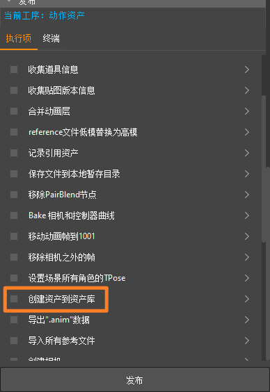 本工具同动作资产发布项【创建资产到资产库】一起工作,发布后的动作资产会资产计入动作资产库中。